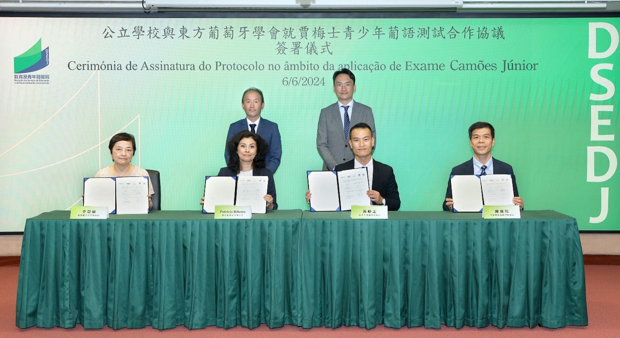 为持续提升澳门公立学校葡语教学效能,加强学生葡语能力,高美士中葡中学、中葡职业技术学校、郑观应公立学校与东方葡萄牙学会签署合作协议,联手推动贾梅士青少年葡语测试。