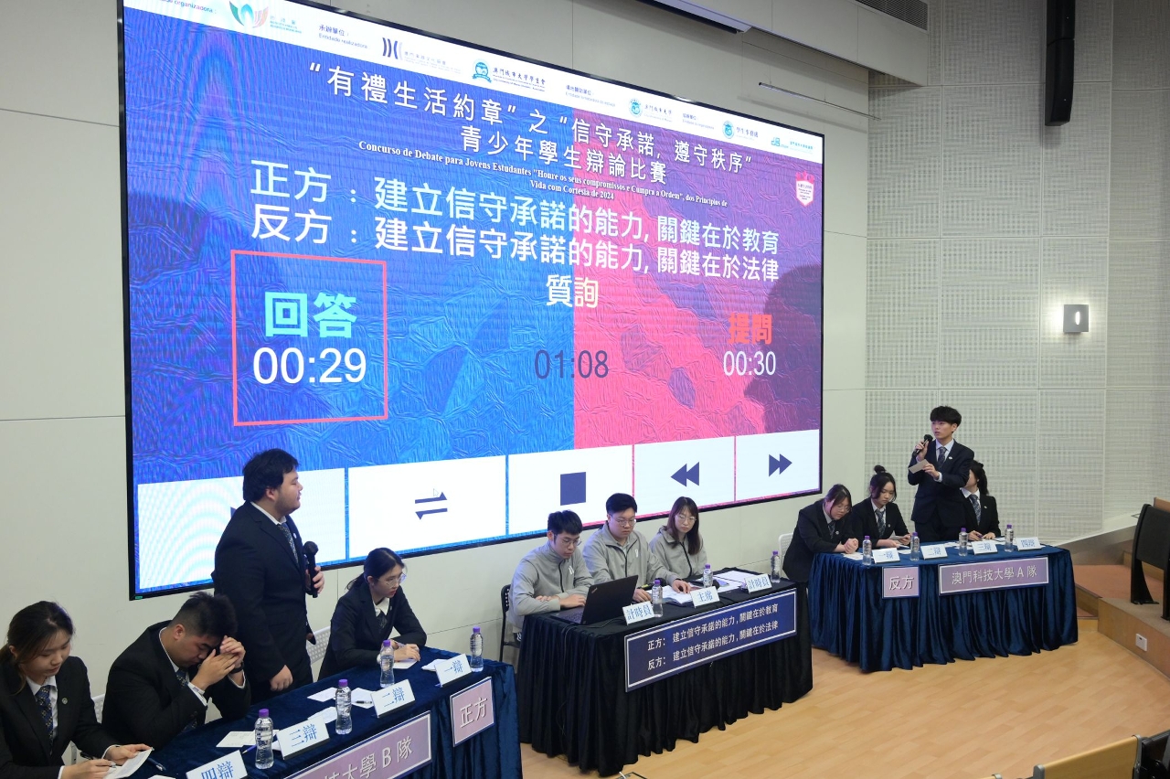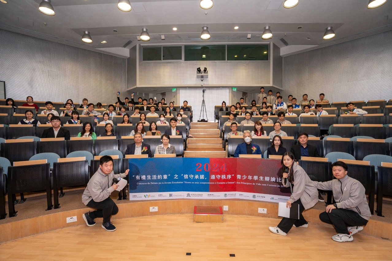 由市政署主办、澳门演辩文化协会及澳门城市大学学生会协办的“2024‘有礼生活约章’之‘信守承诺’及‘遵守秩序’青少年学生辩论比赛”日前顺利举行。来自大专院校及中学的十八支队伍,分别参加广东话少年组、广东话青年组及普通话组别比赛,最后由圣公会(澳门)蔡高中学、澳门大学及澳门科技大学B队分别夺得所在组别的冠军。