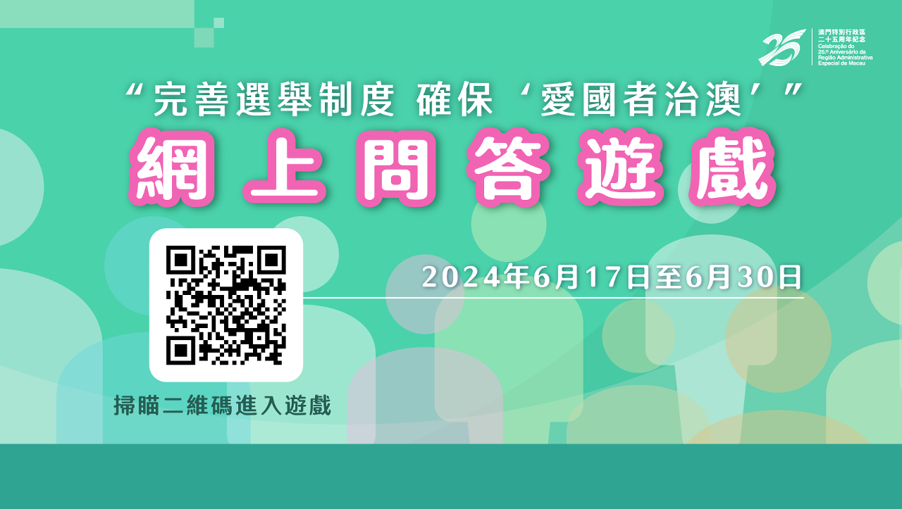 为庆祝中华人民共和国成立75周年及澳门回归祖国25周年,法务局由即日起至6月30日举办“完善选举制度 确保‘爱国者治澳’”网上问答游戏,以加深市民对行政长官选举法和立法会选举法,以及“爱国者治澳"原则的认识。