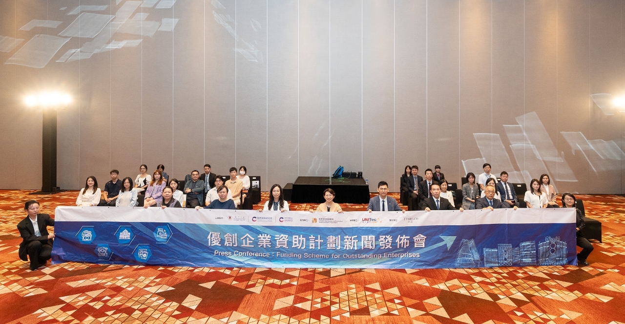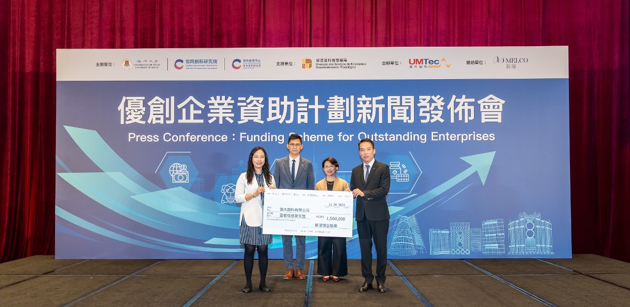 澳门大学创新创业中心和澳大创科有限公司今(21)日举行“优创企业资助计划”新闻发布会。有关计划获新濠博亚娱乐有限公司赞助150万澳门元的初创资助,并向5间入选计划的初创公司提供财务支持,推动澳门创新创业生态发展。