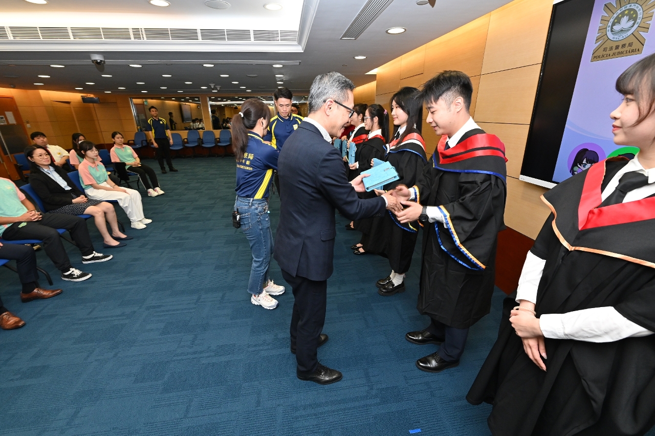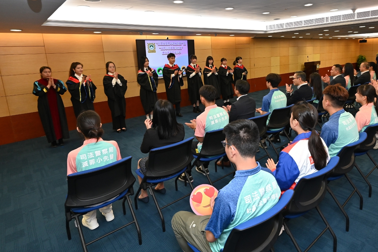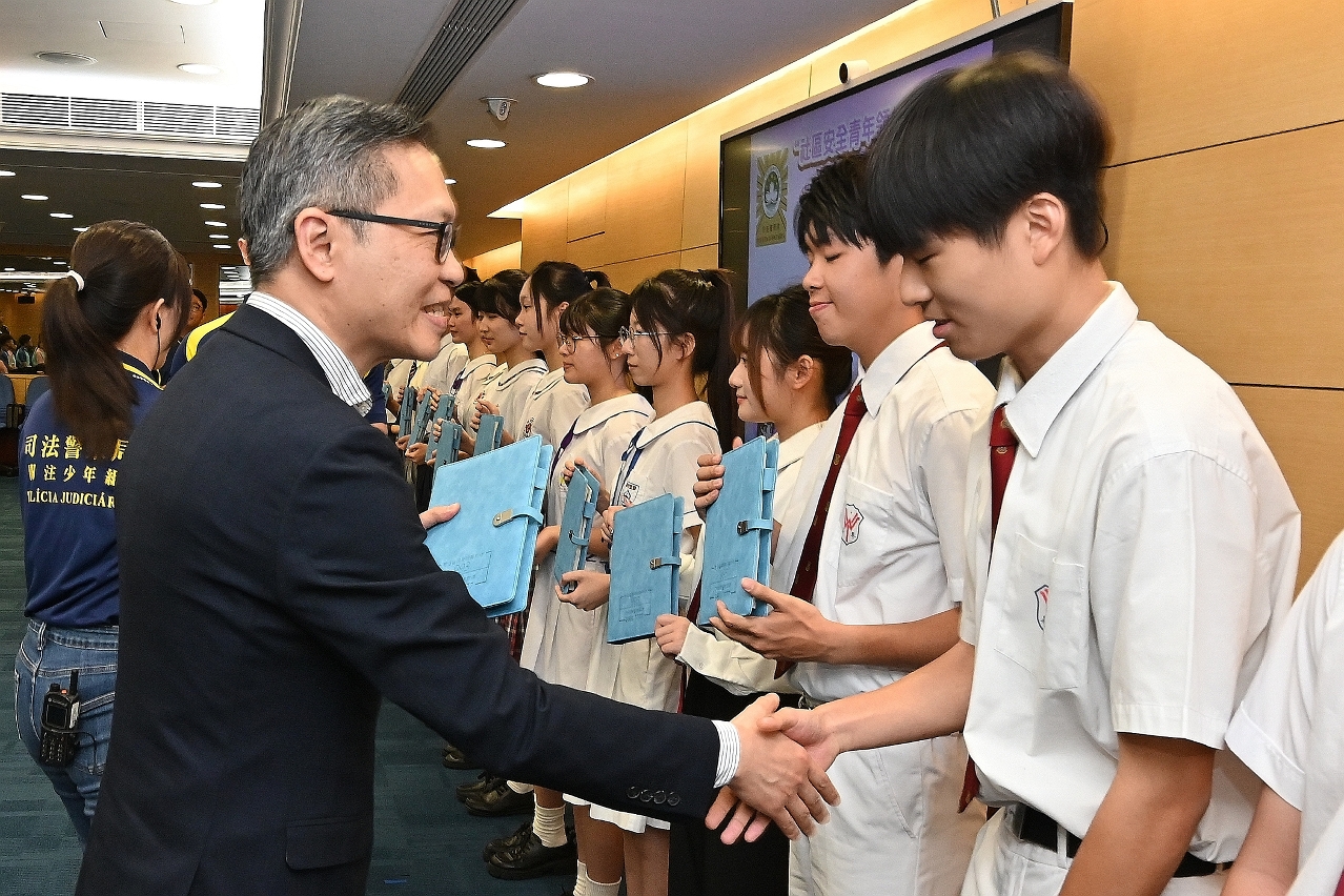 司法警察局为“社区安全青年领袖计划”及“灭罪小先锋种子计划”应届大学及中学毕业学员举办欢送会,司警局局长薛仲明勉励学员继续发扬社区安全青年领袖和灭罪小先锋的精神,协助警方在校园和社会传播警民合作、防罪守法的讯息,并带动更多同辈关心和服务社会,担当起澳门青年的责任和使命,共同为国家和澳门的发展作出有力承担。