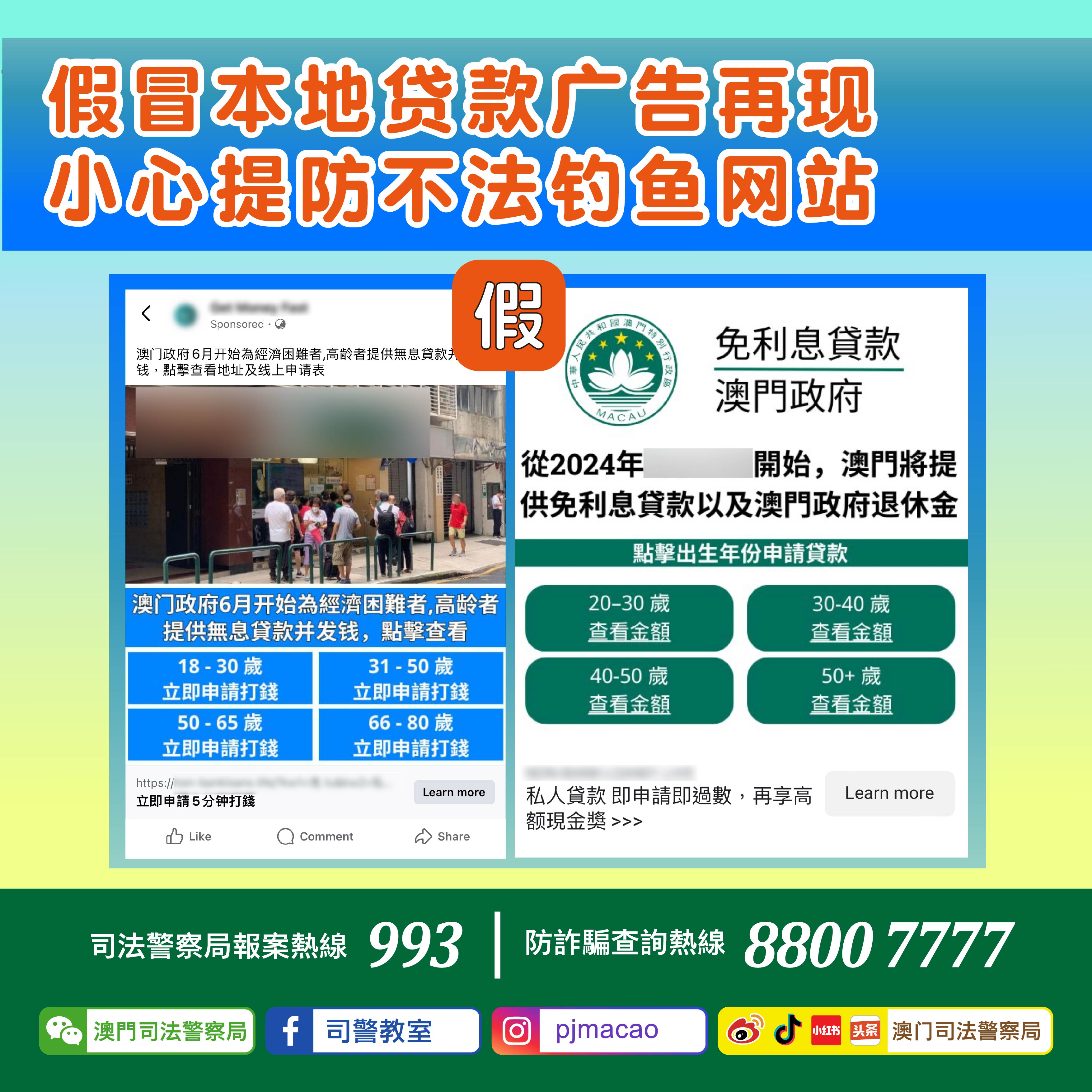 近日,司法警察局于网上社交平台再次发现有人以本地区名义发布不实贷款广告,广告内容载有澳门特别行政区区徽,并讹称澳门政府将提供“免利息贷款”,要求有意者按相应年龄层点击广告附带之连结进行申请。点击上述连结后将会跳转到另一个设置了多个贷款广告之页面,点击相关广告将会随机出现各个邻埠银行及其他来历不明之贷款网站,真伪存疑。