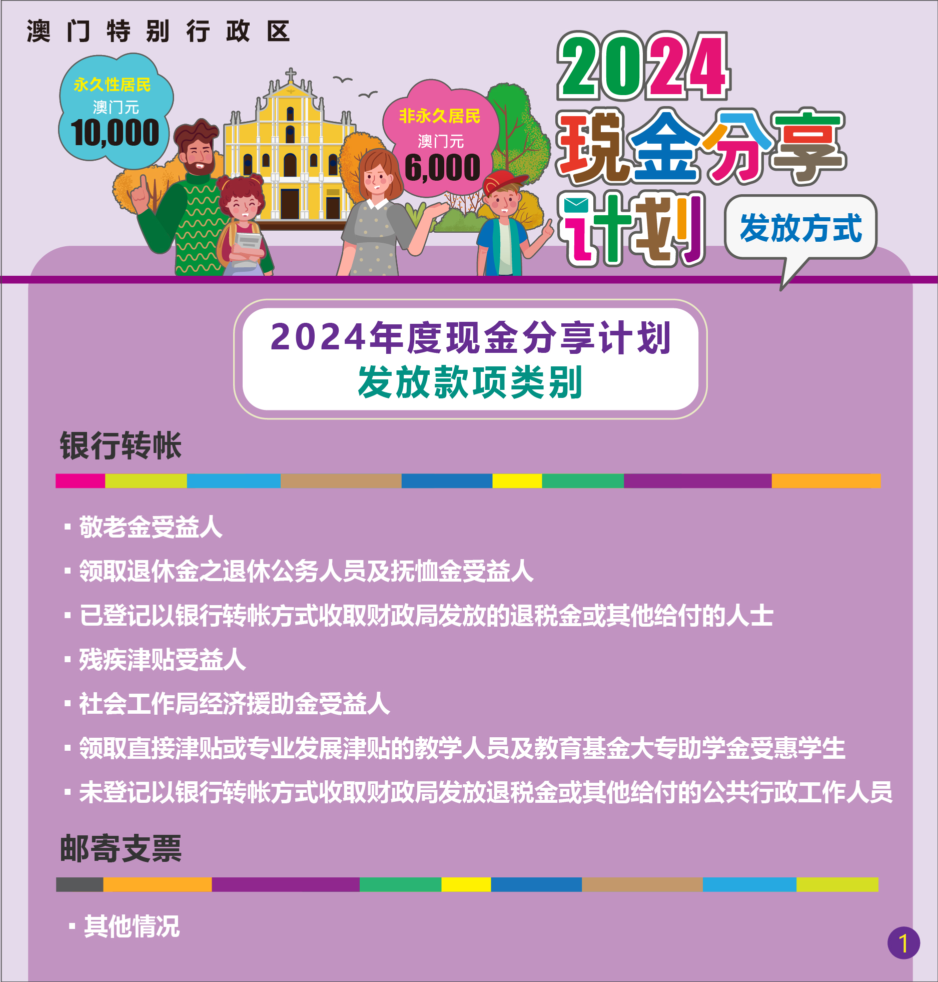 (1)敬老金受益人、(2)领取退休金之退休公务人员及抚恤金受益人、(3)已登记以银行转帐方式收取财政局发放退税金或其他给付的人士、(4)残疾津贴受益人、(5)社会工作局经济援助金受益人、(6)领取直接津贴或专业发展津贴的教学人员及教育基金大专助学金受惠学生、(7)未登记以银行转帐方式收取财政局发放退税金或其他给付的公共行政工作人员,以上凡合资格获发放2024年度现金分享计划款项之人士,将透过银行转帐形式发放。