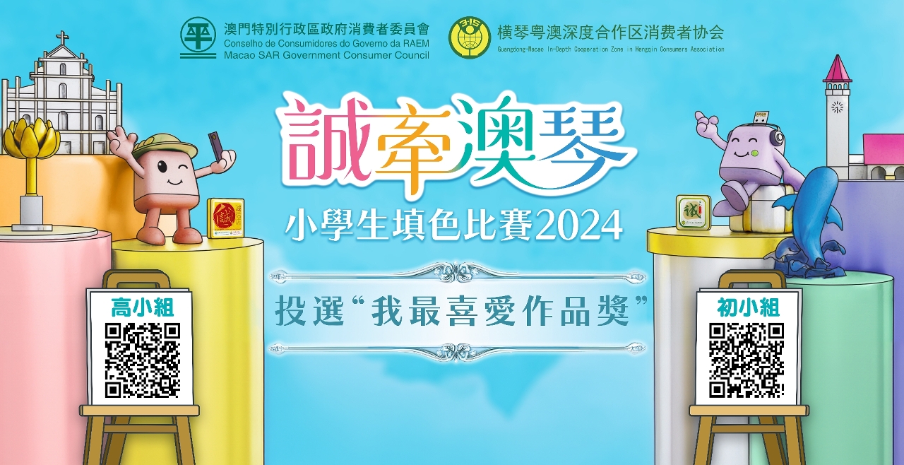 澳门特别行政区政府消费者委员会与横琴粤澳深度合作区消费者协会合办“诚牵澳琴”小学生填色比赛,早前澳门区展开的投选“我最喜爱作品奖”活动,将于本月12日结束,参与投票将有机会获得“竞猜最喜爱作品奖”的抽奖资格。