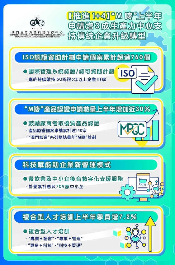 澳门生产力暨科技转移中心为协助企业抓紧“1+4”产业多元发展的机遇,鼓励中小企考取国际标准管理认证(ISO)、参与M唛-澳门产品优质认证计划、提升应用科技赋能,以及加强复合型人才培训等,为传统企业打开新思维,协力创新发展。至今,ISO认证申请累计逾760个,“M唛”今年上半年申请较去年同期增加近30%。该中心将继续配合“1+4”的政策,多管并齐协助传统企业解决升级转型所面对的困难,让企业更好适应新转变及机遇环境。