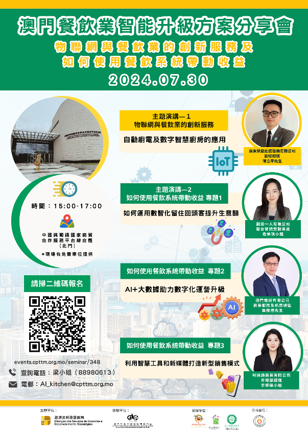 由经济及科技发展局主办、澳门生产力暨科技转移中心承办的“澳门餐饮业智能升级方案分享会”将于下周二(30日)下午3时至5时在中国与葡语国家商贸合作服务平台综合体举行,活动将邀请行业专家分享餐饮业如何利用科技提质发展,欢迎餐饮业界及有兴趣人士报名参与。