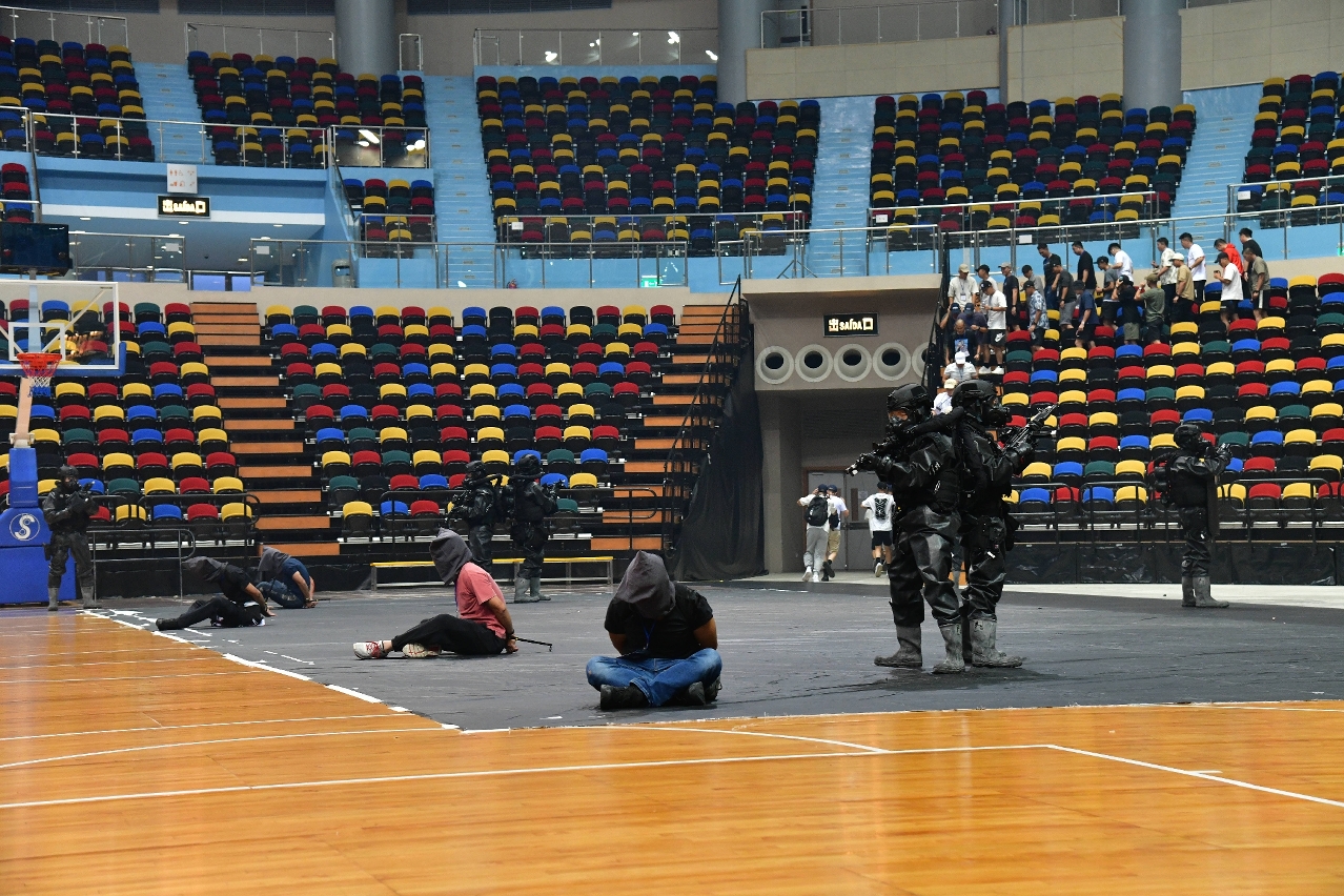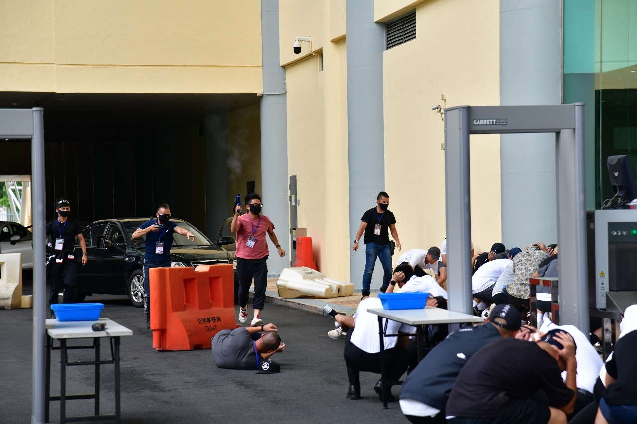 演练模拟共有7名恐怖分子,其中6名恐怖分子乘坐2辆汽车高速撞入一场大型演唱会的临时安检站,并用利刀砍伤多名人士。随后6人与赶抵的警员爆发枪战,其中1人被击中受伤,与另1同伙驾车逃离,另外4人在抛掷一枚氯气弹后,掳劫2名保安员进入场馆,并胁持馆内8000观众与警方进行谈判。期间,临时安检站内数名人士因吸入有毒气体感到不适。