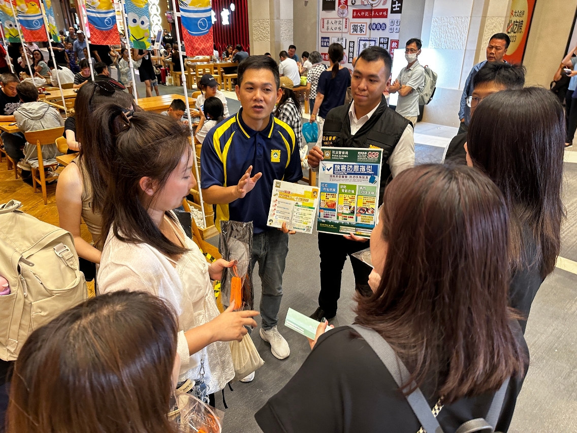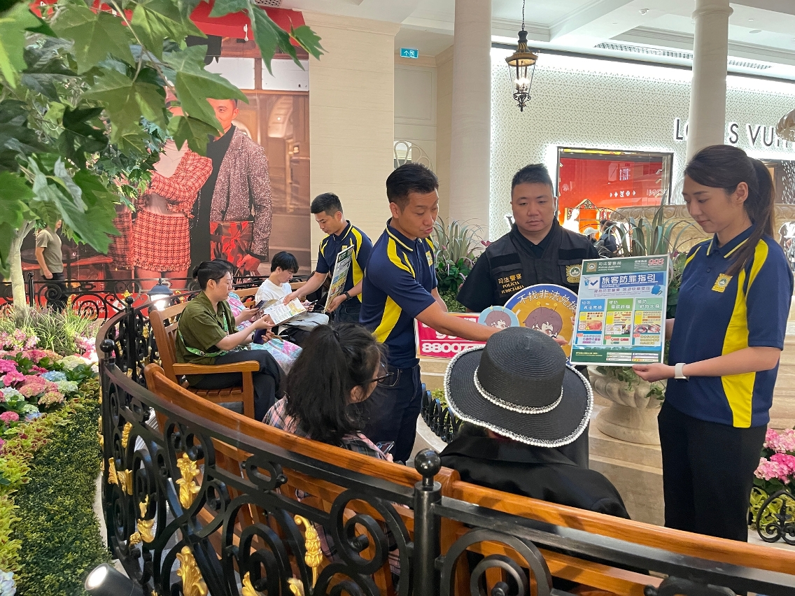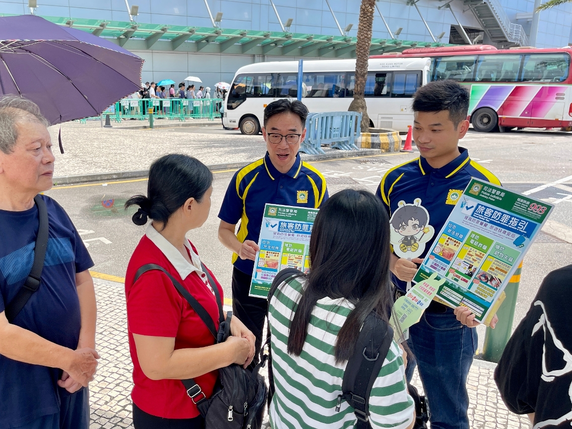 因应暑假期间访澳旅客增多,司法警察局加强面向旅客群体的防罪部署,于7月17日至28日期间派员到本澳各个口岸及酒店穿梭巴士站点展开防罪宣传,向旅客派发防罪宣传单张并讲解关于非法兑换货币、电讯诈骗及盗抢犯罪等防罪资讯及风险提示,务求提升旅客的防罪警觉及能力,免受不法侵害。