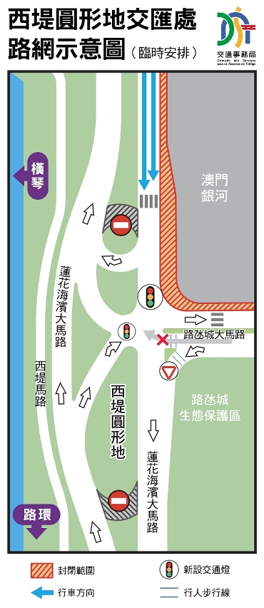 由于现时西堤圆形地周边仍有工程进行,现场交通路况仍较为复杂,敬请市民留意周边交通安排。交通事务局会继续密切留意现场的交通情况,适时调整交通安排。