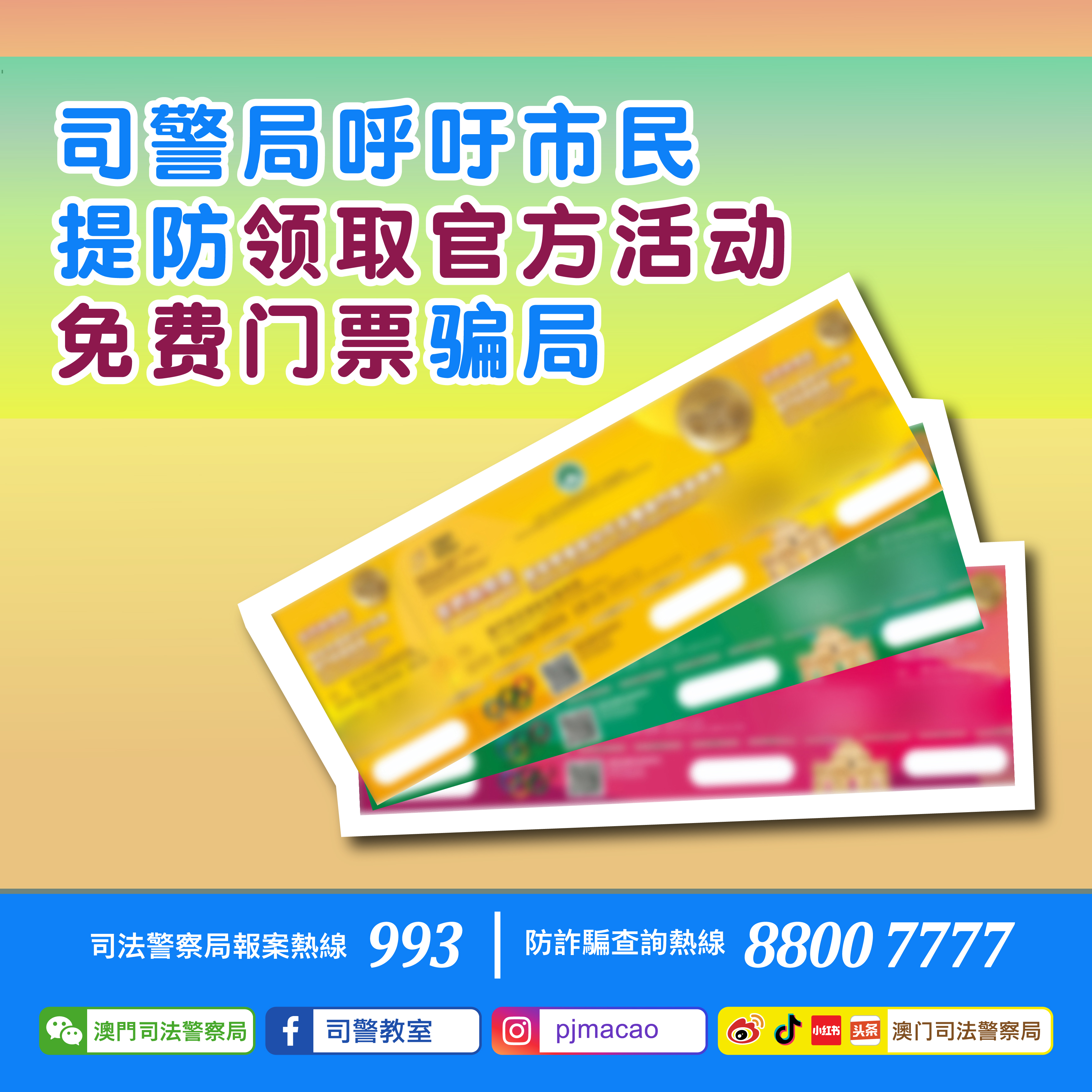 近日,国家奥运健儿代表团将会访澳,特区政府将举行大型联欢晚会欢迎代表团,并向公众免费派发门票。为防有不法分子趁机混水摸鱼行骗,司警局呼吁市民须提高警惕,应透过官方途径领取活动门票,避免从网络购买不明来历的门票,慎防堕入骗局。同时,提醒市民切勿炒卖或兜售活动门票,有关行为可能会触犯法律。