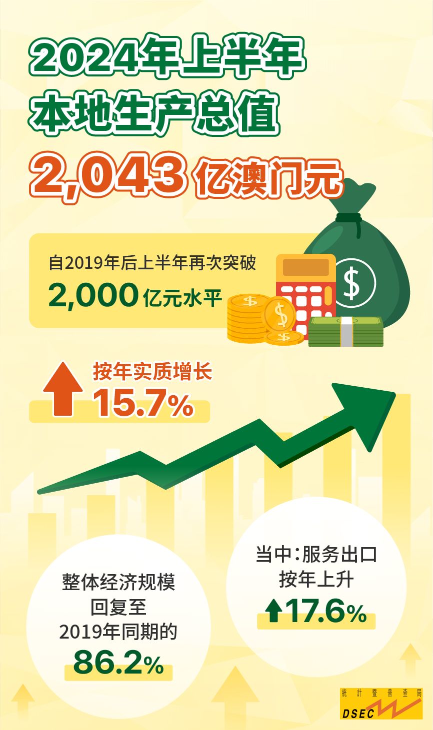统计暨普查局资料显示,2024年上半年本地生产总值为2,043亿元(澳门元,下同),按年实质增长15.7%,整体经济规模回复至2019年同期的86.2%,更是自2019年后再次突破2,000亿元水平。当中,服务出口按年上升17.6%,内部需求(包括私人消费支出、政府最终消费支出及投资)亦录得2.8%的增幅。