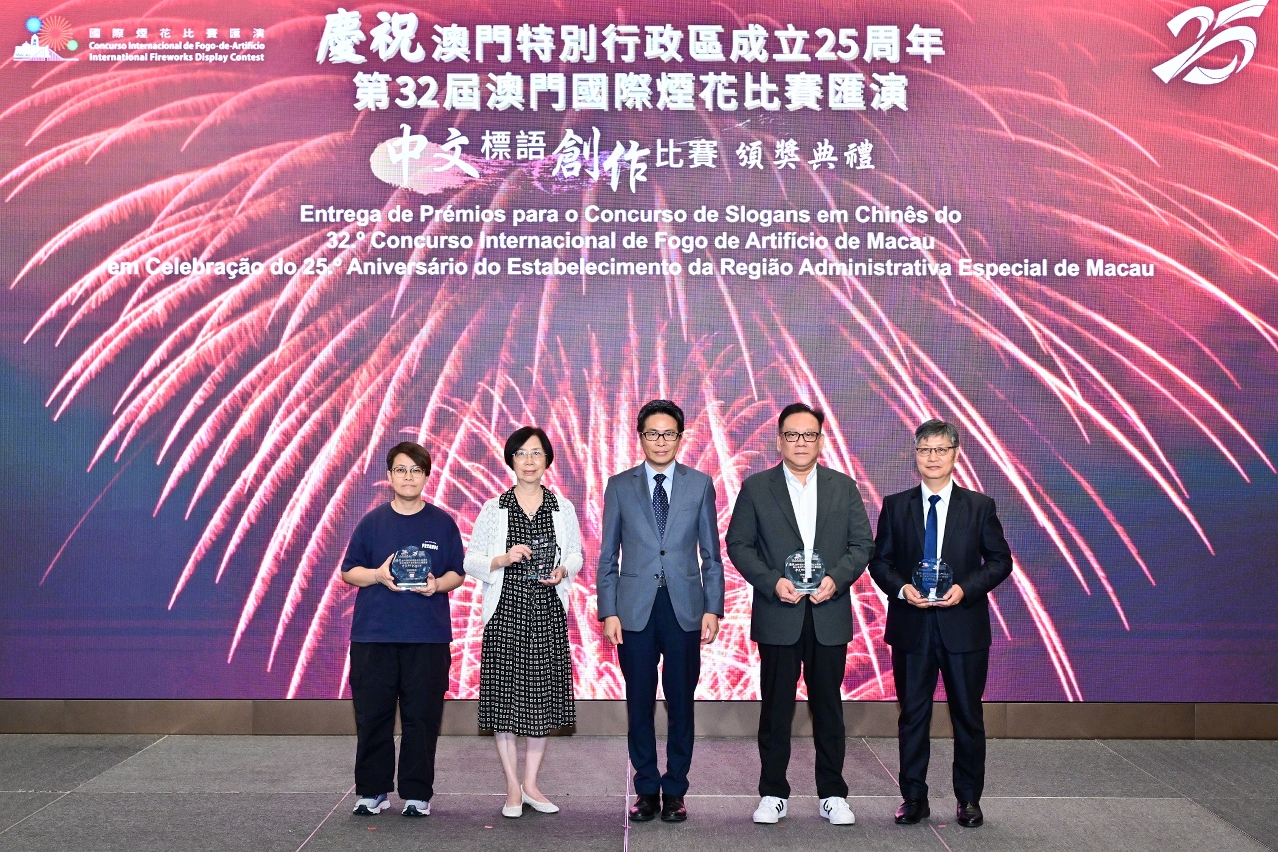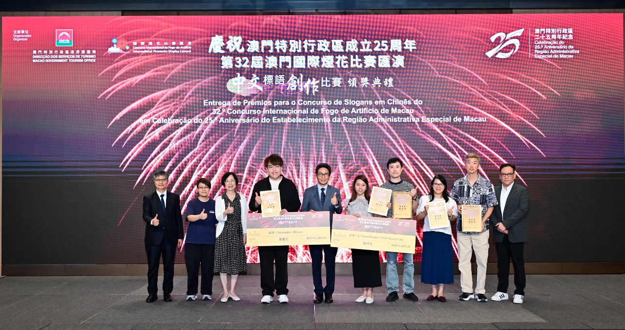 年度盛事活动“庆祝中华人民共和国成立75周年、澳门回归祖国25周年 第32届澳门国际烟花比赛汇演”于今(28日)举行新闻发布会,同场举行中文标语创作比赛颁奖典礼,公布得奖结果并颁发奖项。