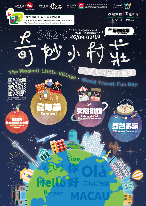 “2024奇妙小村庄之世界旅游同乐日”于9月26日至10月2日期间的星期一至五下午4时至晚上10时,以及星期六、日下午1时至晚上10时,在塔石广场举行,活动期包括9月27日世界旅游日。活动融合旅游、体育、文化及经济四大元素,推动“旅游+”跨界融合。活动现场设有各类运动、美食、本地文创产品和游戏摊位,更特设期间限定的表演和抽奖,让居民和旅客体验澳门社区的活力,探索本地艺术创作和文创产品,同时享用特色美食。