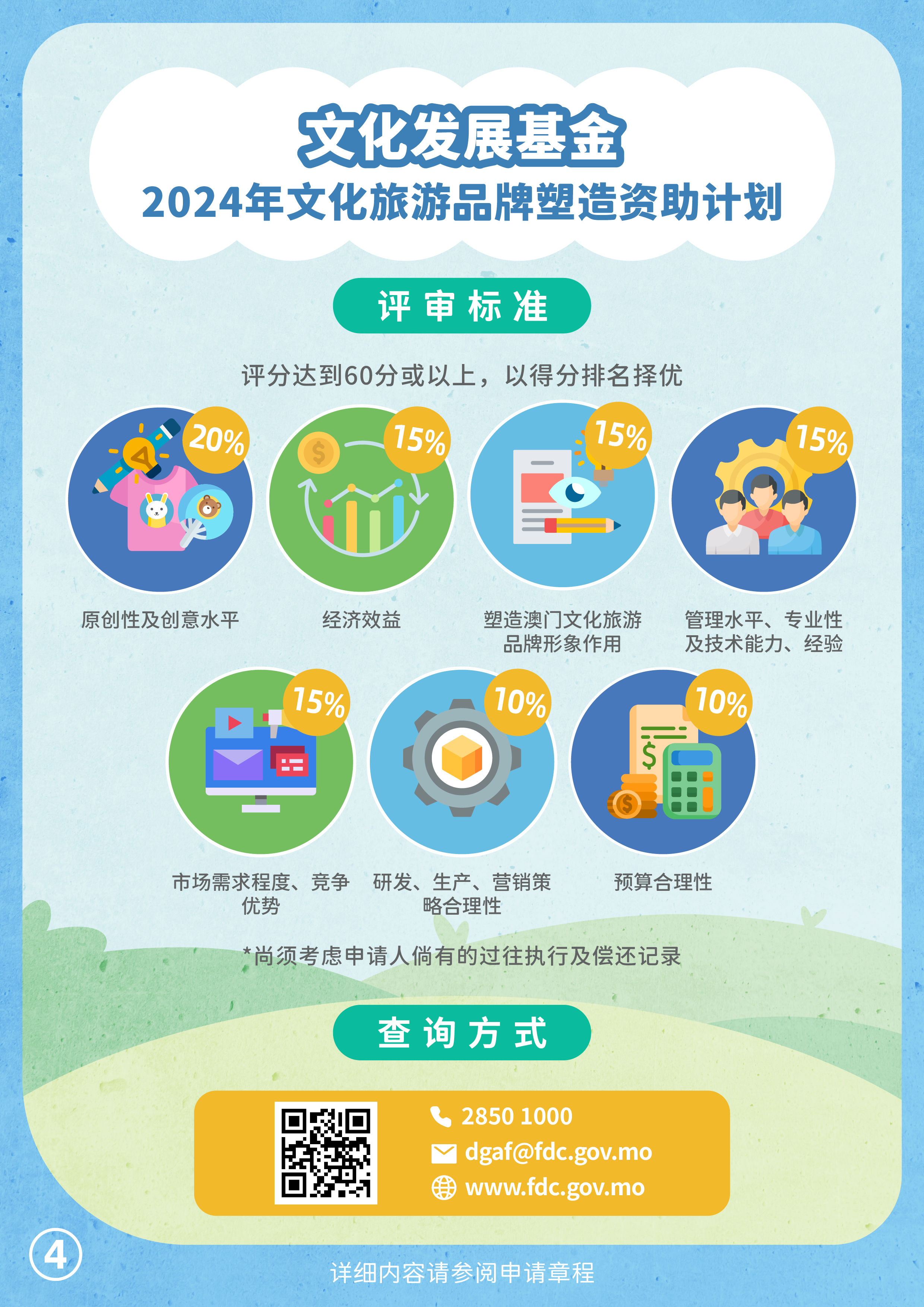 为详细介绍“2024年文化旅游品牌塑造资助计划”的申请事宜及解答申请人问题,基金将于10月3日下午4时假诚丰商业中心7楼演讲厅(地址:澳门宋玉生广场322-362号)举行专场讲解会,有兴趣人士请到基金网站(www.fdc.gov.mo)“电子服务及资讯下载区”的“报名登记系统”内报名,查询请致电2850 1000或电邮dgaf@fdc.gov.mo。