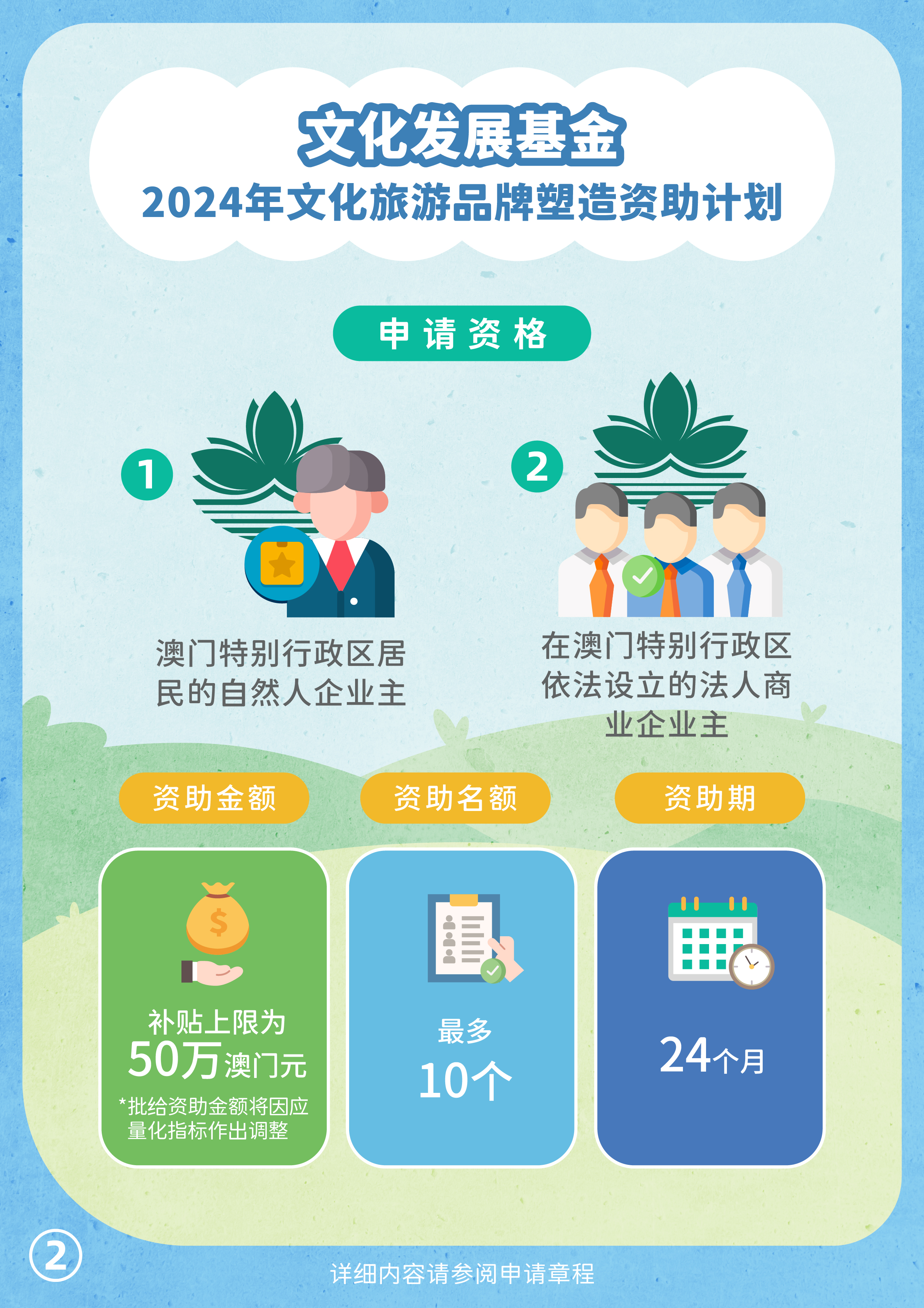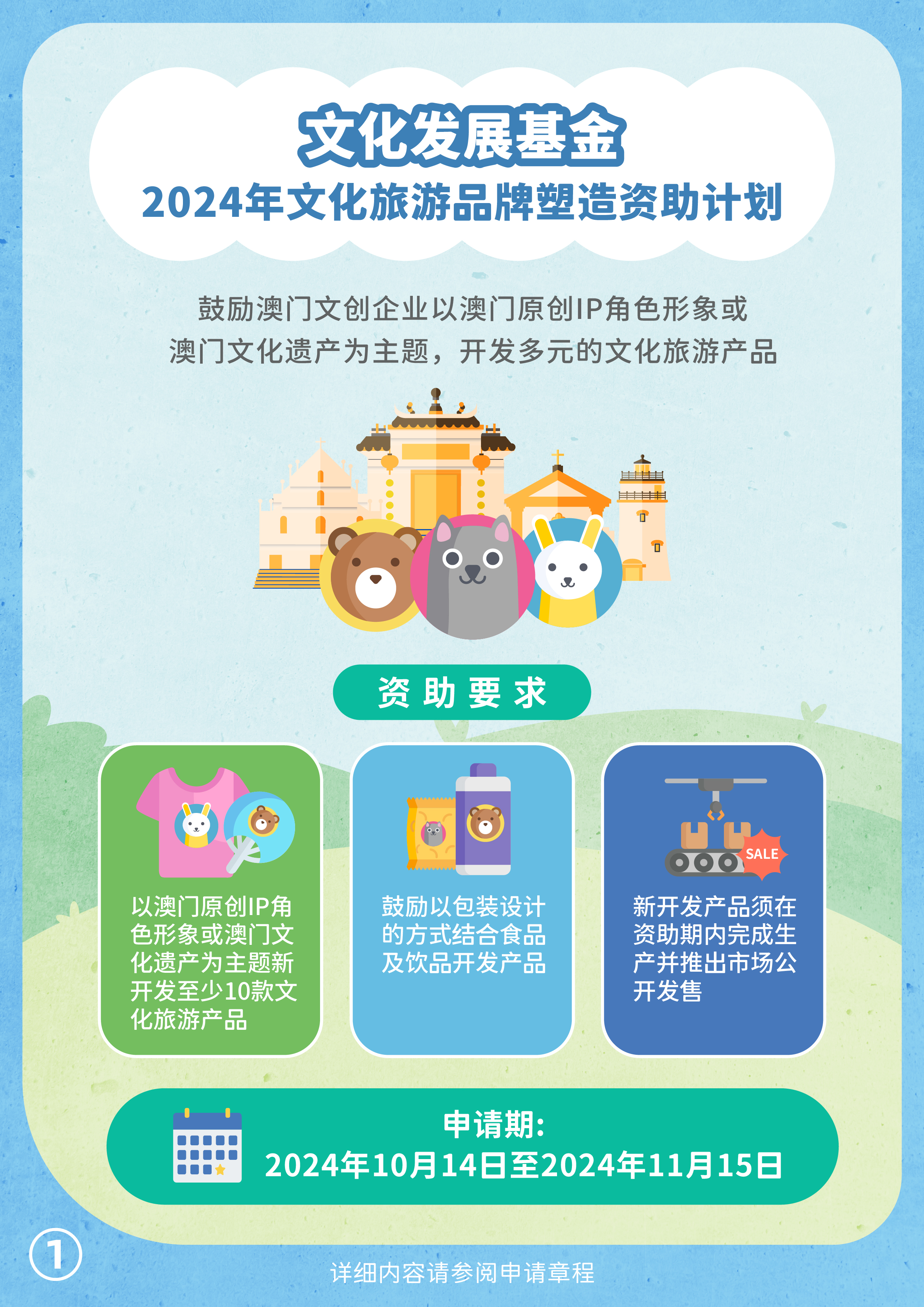 文化发展基金将于10月14日至11月15日接受“2024年文化旅游品牌塑造资助计划”申请,鼓励澳门文创企业以澳门原创IP角色形象或澳门文化遗产为主题,开发多元的文化旅游产品。