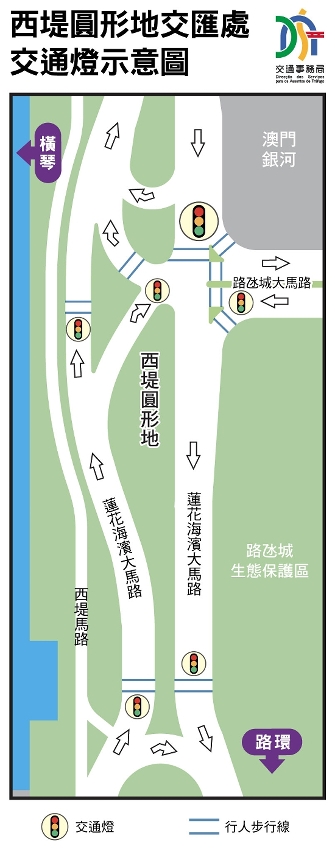 配合西堤圆形地交汇处路网重整工程竣工,10月5日(周六)上午将开通路氹城大马路往氹仔方向的行车路段,以及各个方向的交通灯和步行线。其中西堤圆形地中央交汇处新建的安全岛至西堤马路单车径的步行线设有行人触控式交通灯,其余则为一般交通灯。