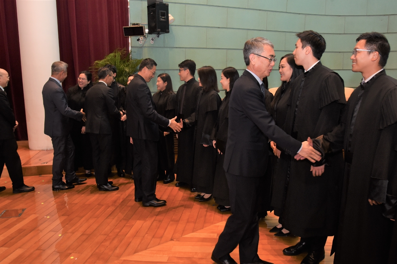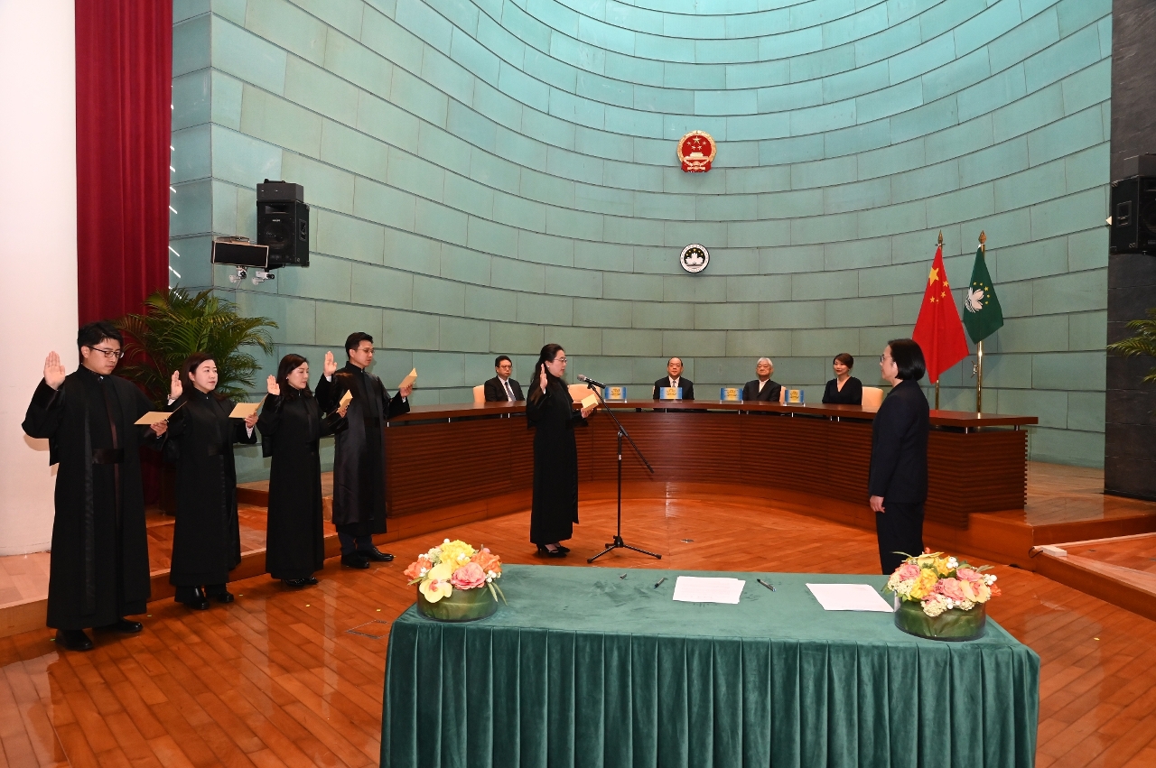2024年10月15日下午3时30分,于终审及中级法院大楼审判庭举行就职仪式。上述十五名法官在终审法院代院长宋敏莉主持及监誓下宣誓就职,行政长官贺一诚、推荐法官的独立委员会主席刘焯华、中级法院院长唐晓峰及第一审法院院长姚颕珊列席主礼台。行政法务司司长、检察院检察长、廉政专员、推荐法官的独立委员会委员、澳门律师公会理事会主席、各级法院法官及检察官、相关部门领导等嘉宾以及法院众多职员出席就职仪式。