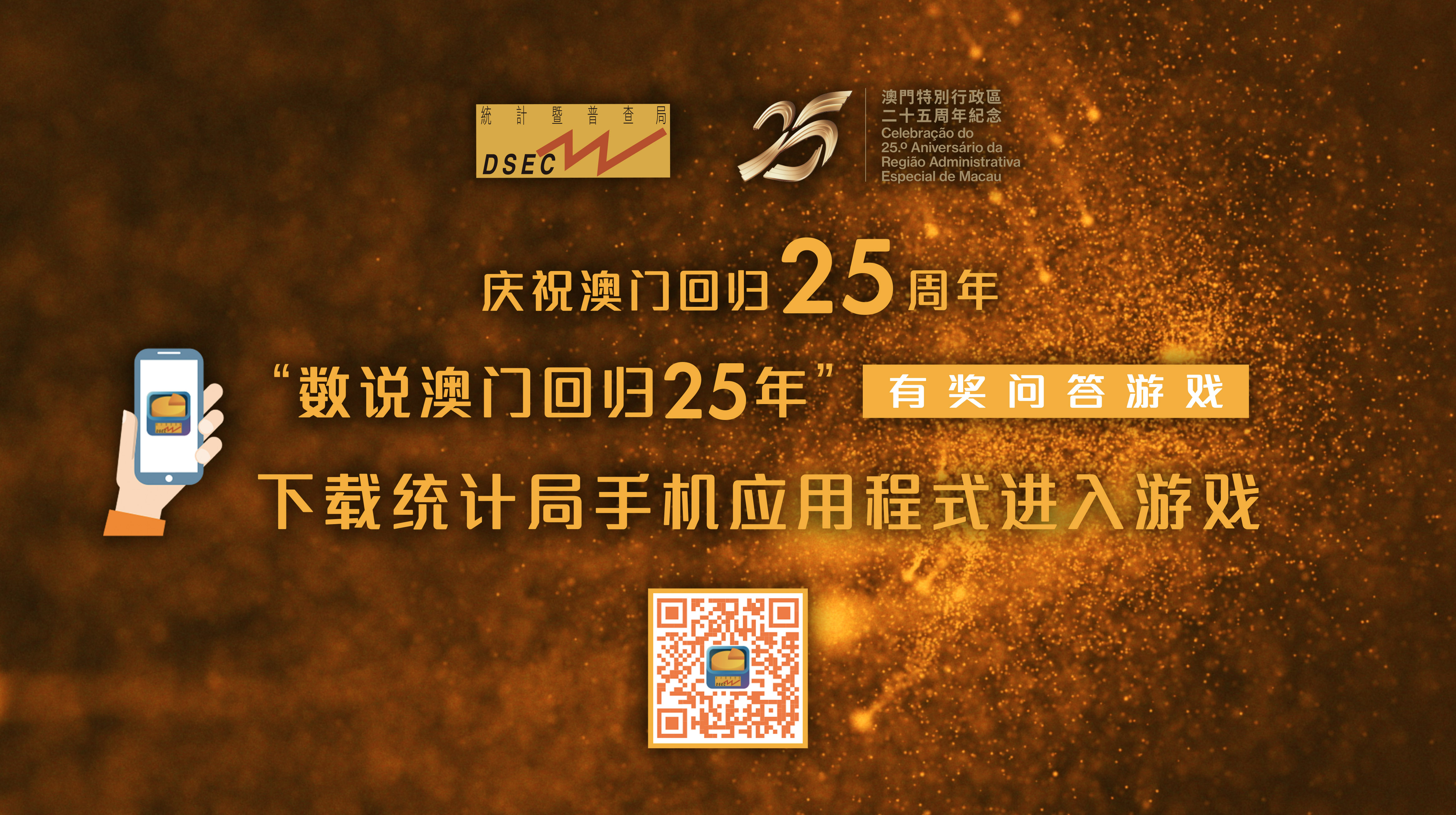 为庆祝澳门特别行政区成立二十五周年,统计暨普查局举办“数说澳门回归25年”有奖问答游戏与市民共贺回归,冀让大众透过游戏中的统计数据了解澳门回归以来社会及经济等方面的发展与变化。