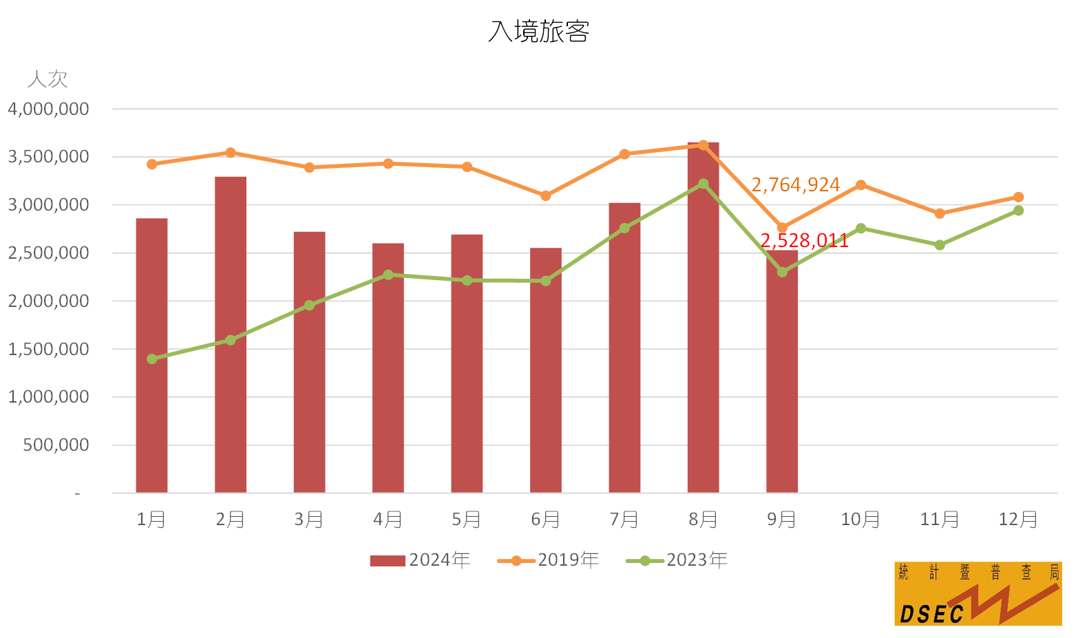 2024年9月的入境旅客共2,528,011人次,按年上升9.9%,恢复至2019年同月的91.4%。国际旅客(173,614人次)按年上升37.6%,恢复至2019年同月的92.7%。不过夜旅客(1,308,147人次)及留宿旅客(1,219,864人次)按年分别增加15.6%及4.3%。旅客平均逗留时间(1.3日)较2023年9月缩短0.1日。
