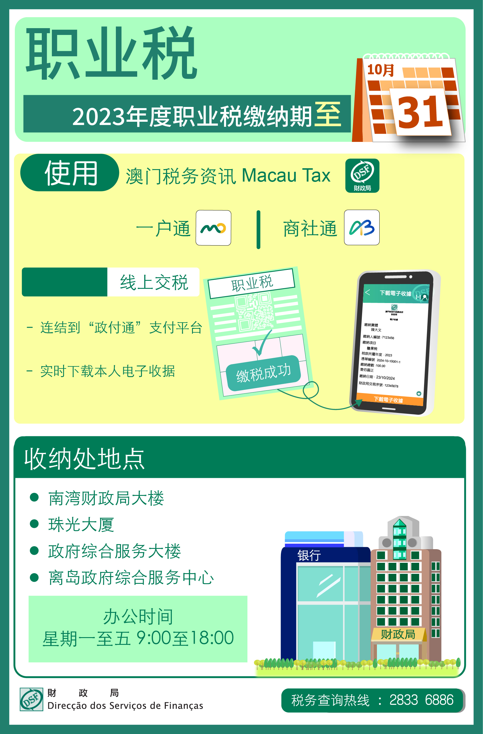 财政局提醒职业税纳税人,2023年度从收益中扣缴之职业税税款及结算税款间之差额,最后缴纳期限至10月31日。为免因逾期缴纳而附加过期利息及罚款,仍未缴纳上述税款之纳税人须尽快缴纳。