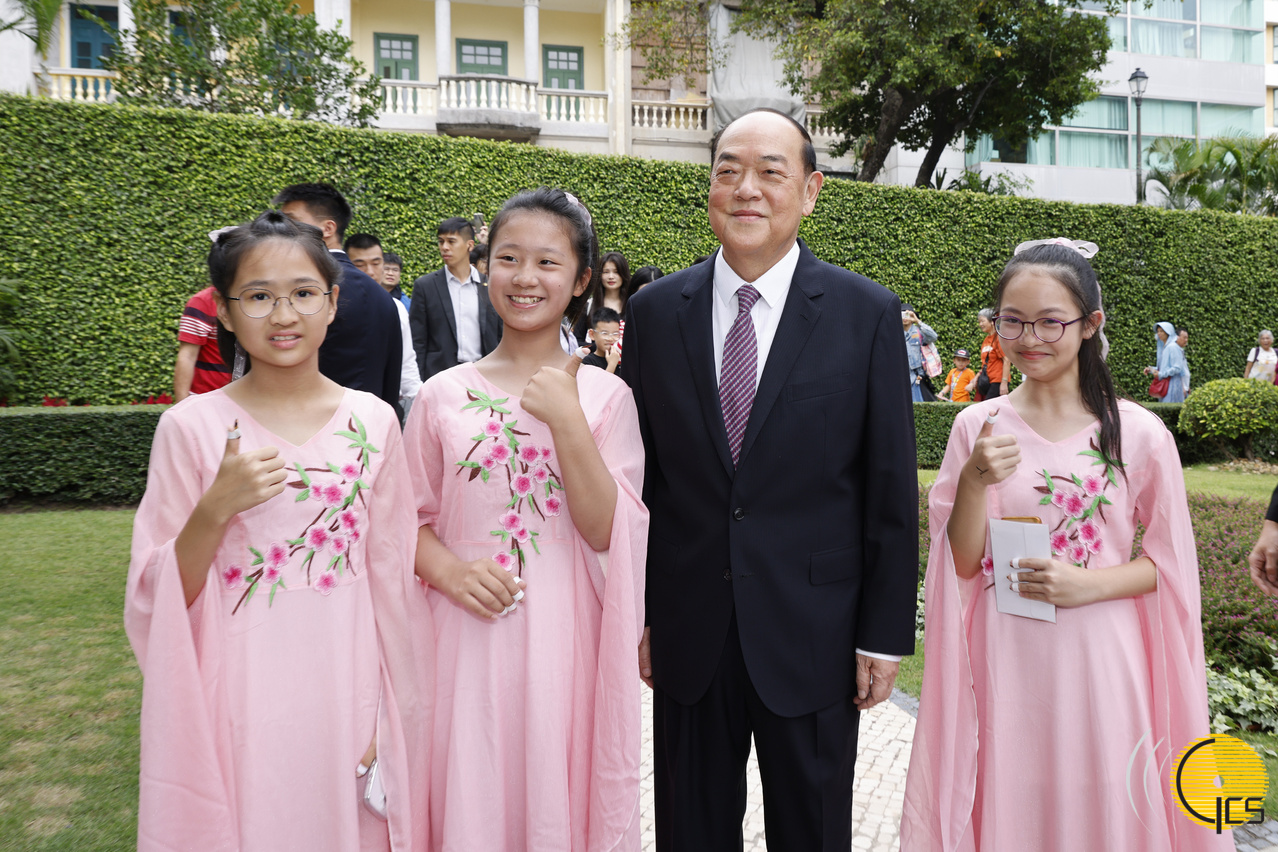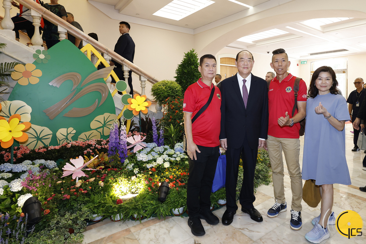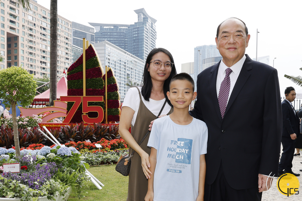 行政长官甫一抵达政府总部,就与在场参观的一众访客互相致意问好,在欢乐声中首先步行至花园,共同观赏主题为“庆祝中华人民共和国成立75周年及澳门回归祖国25周年”的开放日展示花卉,期间与参观人士驻足欣赏和交谈互动。行政长官表示,在双庆之年举行政府总部开放日别具意义,很高兴看到双庆主题的花展受到大家欢迎,值得拍照留念,共同喜贺双庆之年和感受浓厚节庆气氛。