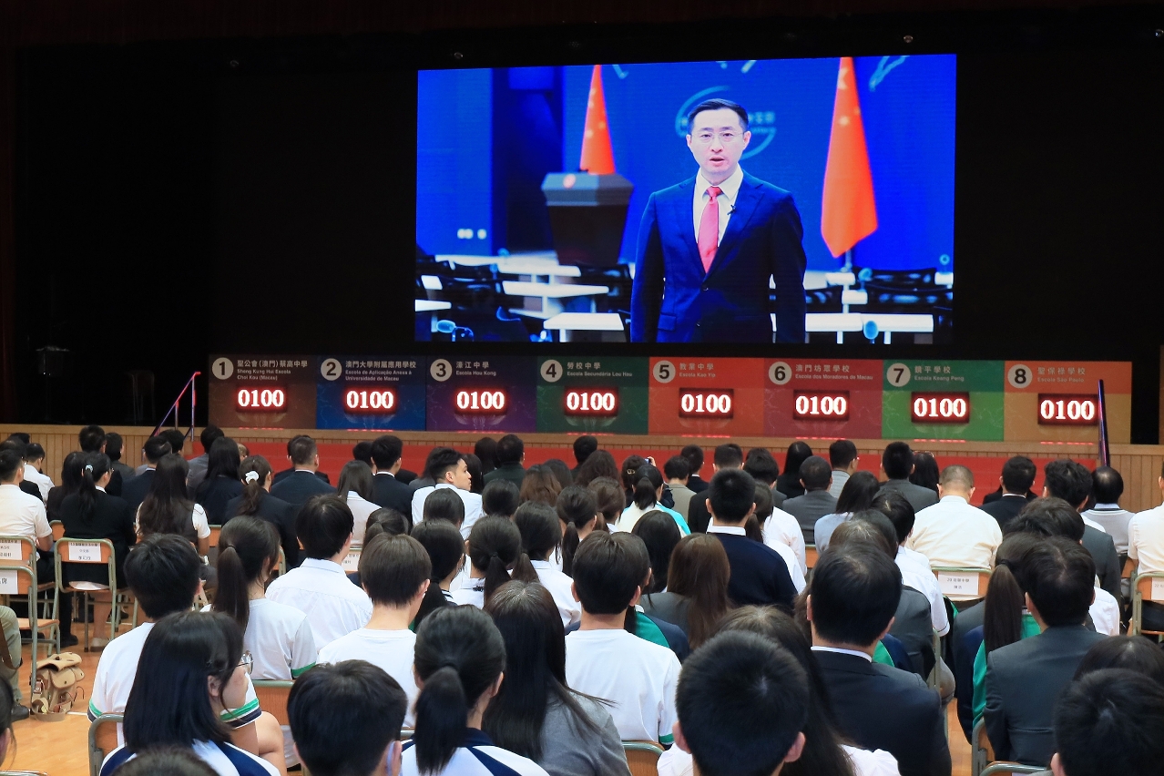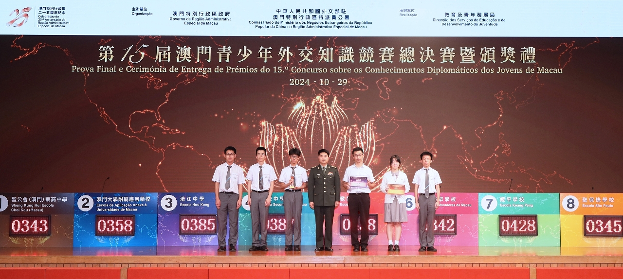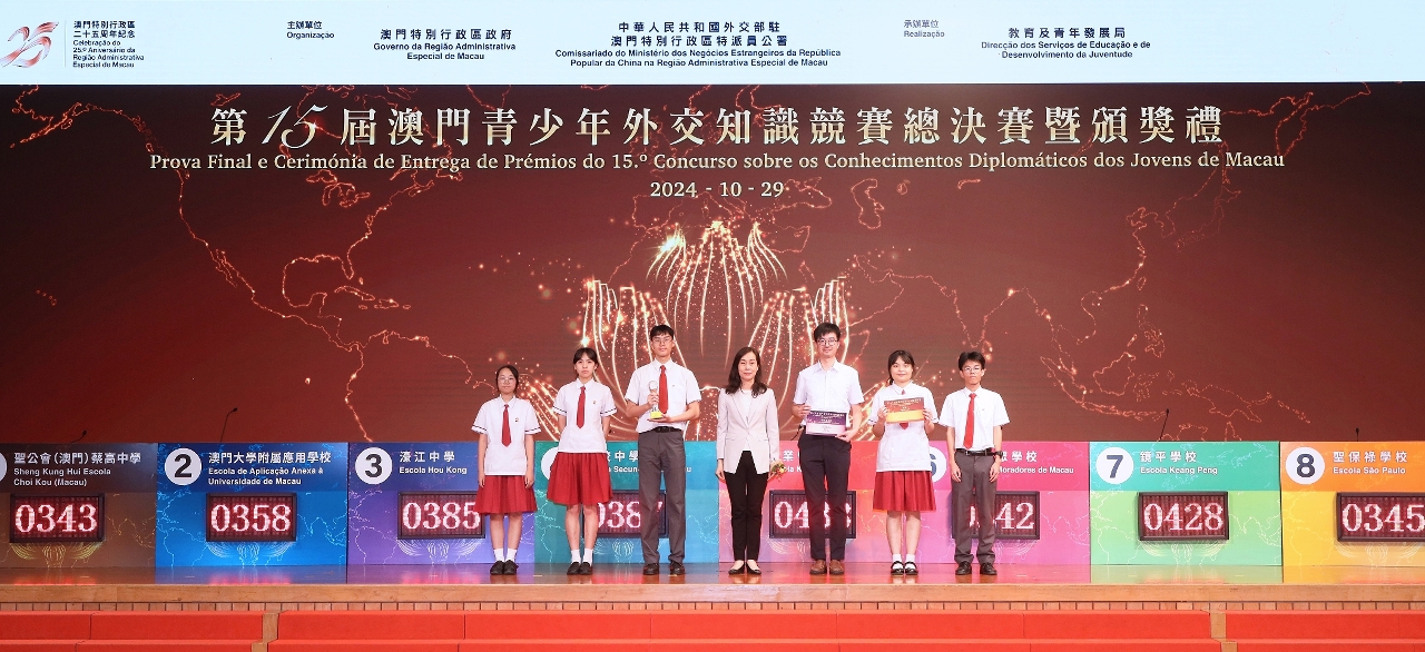 适逢中华人民共和国成立75周年、澳门特别行政区成立25周年,由澳门特别行政区政府与中华人民共和国外交部驻澳门特别行政区特派员公署主办、教育及青年发展局承办的第15届澳门青少年外交知识竞赛总决赛暨颁奖礼于10月29日成功举行。竞赛综合考验参赛学生对习近平外交思想、中国特色大国外交、涉澳外交、外交史、外交常识、时政热点等的掌握和运用,得到特区社会各界广泛支持。本届参与的学校共37所,学生人数达 9,000人,由推广赛、初赛到脱颖而出进入总决赛的8支队伍,经过一轮紧张的外交知识较量,最终获得冠军的是教业中学,亚军、季军和殿军的队伍分别是镜平学校、劳校中学、濠江中学,获优异奖的是:澳门大学附属应用学校、圣保禄学校、圣公会(澳门)蔡高中学、澳门坊众学校。