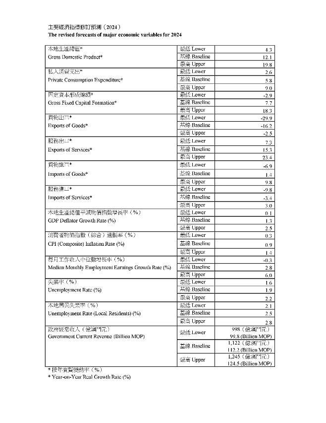 • 物价变动(澳门生产总值平减指数)的基线预测为上涨1.3%;消费物价指数升幅则为0.9%。