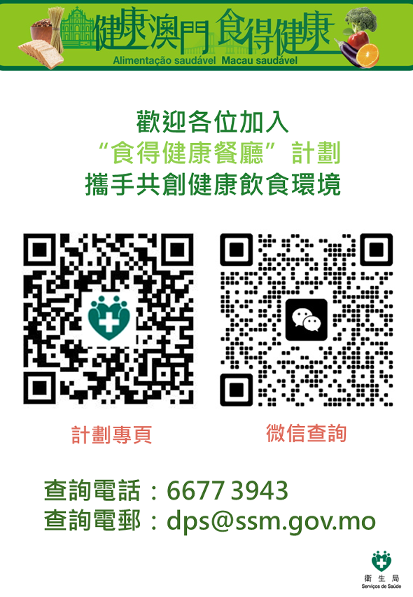 此外,参与商户的资讯可获上载于卫生局网页的“食得健康”专页及三大外卖平台的“食得健康餐厅”专区,助力商户宣传健康菜式。如欲了解详情,可浏览卫生局“食得健康”专页(www.ssm.gov.mo/healthyeating/),亦欢迎致电或微信66773943查询,或电邮dps@ssm.gov.mo。卫生局期望透过政府的倡导和推动,业界的动员和支持,以及市民的配合和参与,共同协作实现“健康澳门”的愿景。