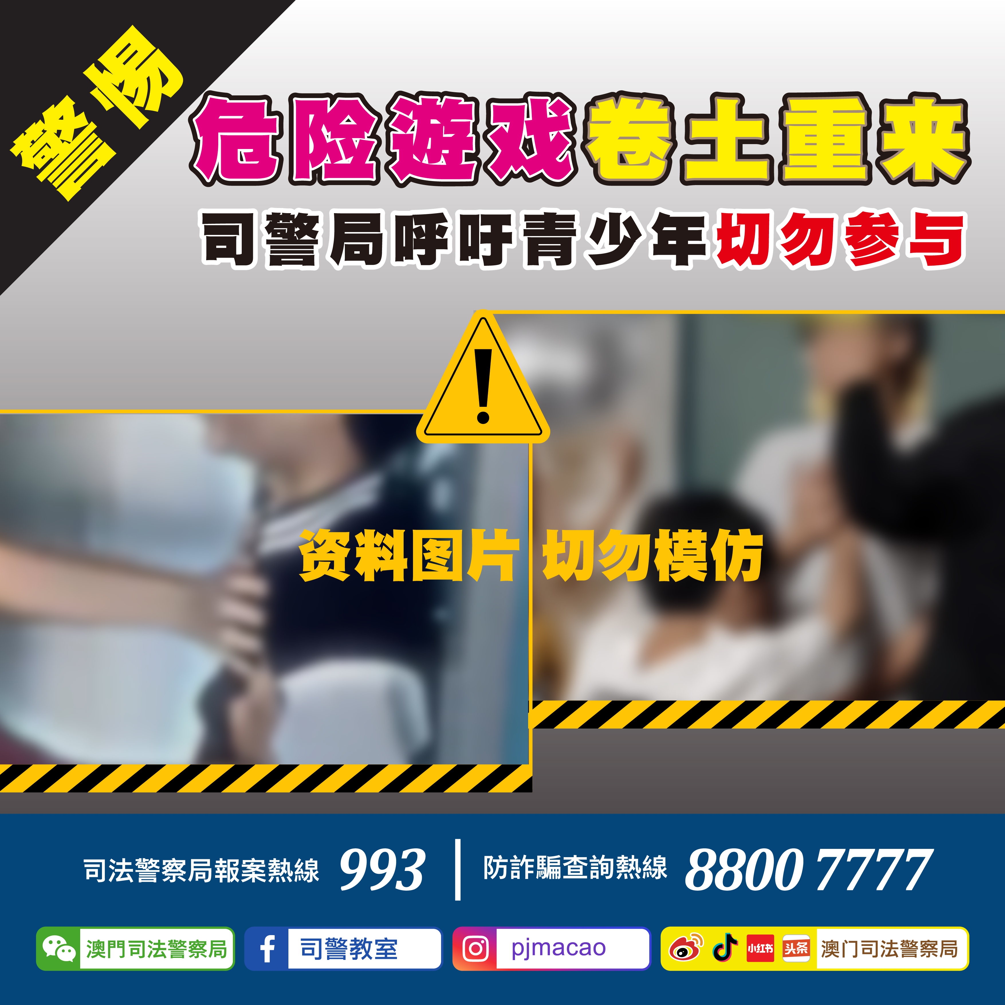 司警局在此特别提醒青少年玩乐时须注意安全并衡量后果,切勿为寻求一时刺激或抱持恶作剧心态而参与或模仿危险游戏和行为,以免危及他人生命安全,导致悲剧发生并负上刑事责任。