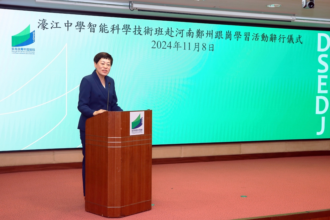 教育及青年发展局积极推动学校开办资讯科技教学、STEM课程和编程教育,培养学生的科学素养、专业技能及科技视野。濠江中学高中“智能科学与技术课程”于本年11月10日至16日前往河南省郑州市的科技企业进行跟岗学习,由30名师生组成的代表团于日前到教青局辞行。教青局局长龚志明、副局长黄嘉祺,濠江中学副校长陈虹、周明,以及协助在郑州当地学习事项的澳门润达软通科技有限公司董事长颜远港,软通智慧科技有限公司总经理张梦弛等出席辞行仪式。
