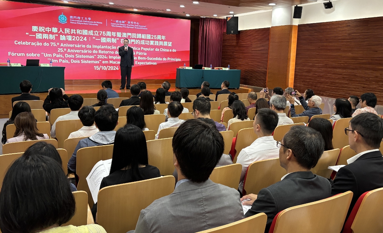 为庆祝中华人民共和国成立75周年、澳门特别行政区成立25周年,总结澳门成功实践“一国两制”的经验,贯彻“一国两制”方针,澳门理工大学“一国两制”研究中心举办“‘一国两制’论坛2024:‘一国两制’在澳门的成功实践与展望”,来自内地和澳门的专家学者及学生近一百人出席。