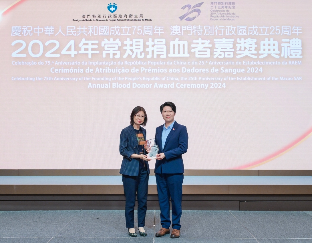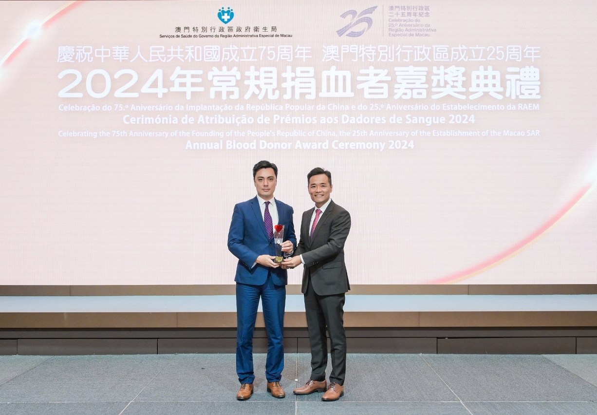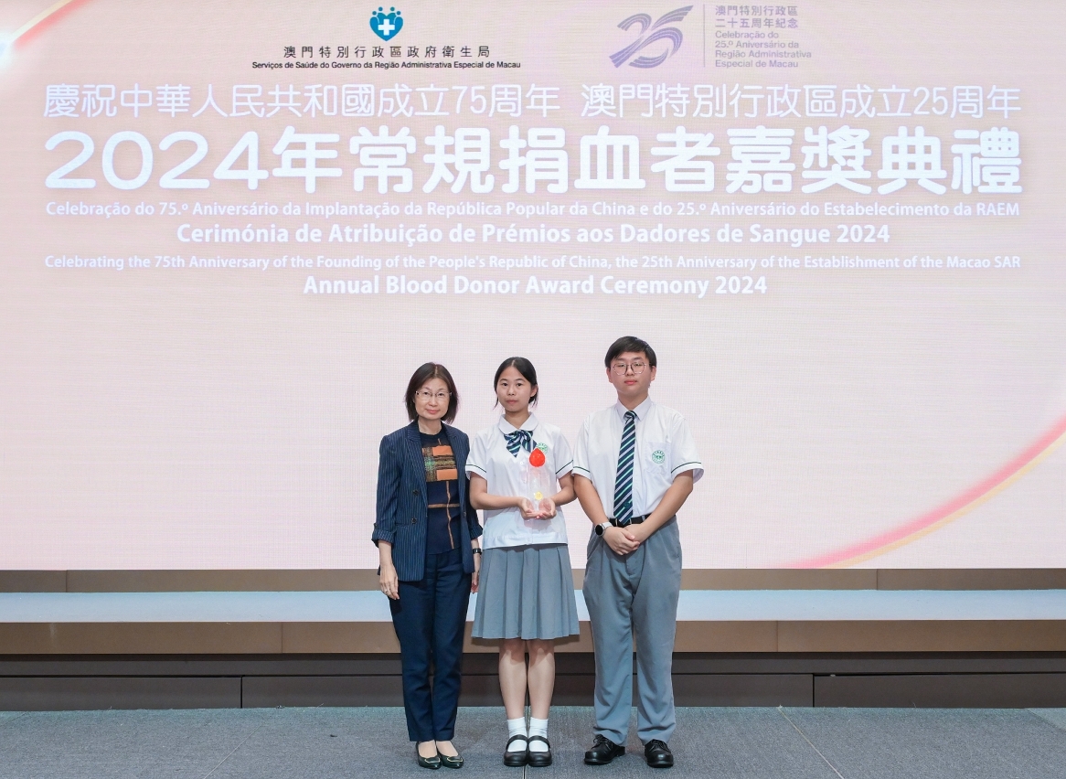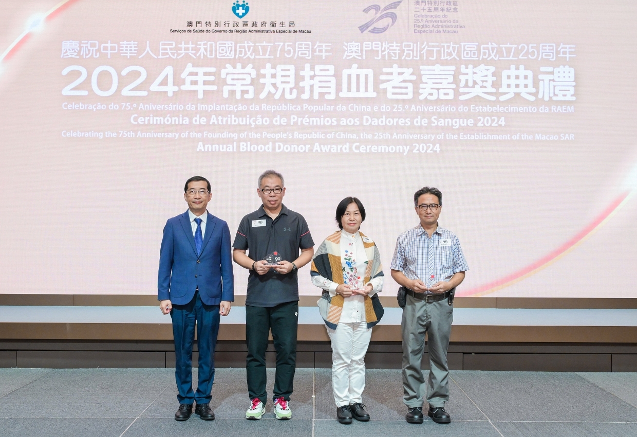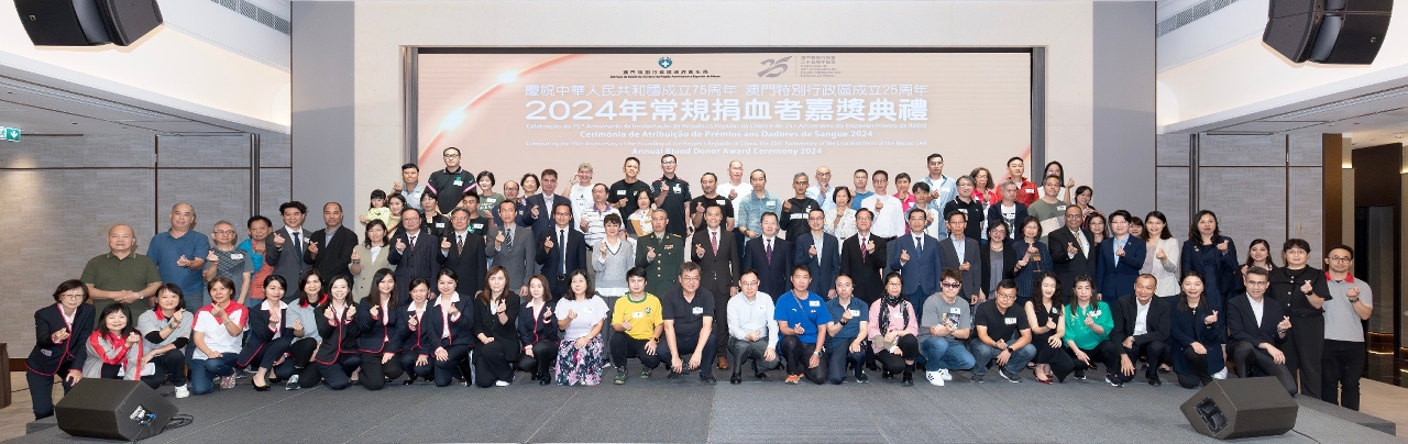 庆祝中华人民共和国成立75周年、澳门特别行政区成立25周年-2024年常规捐血者嘉奬典礼于日前圆满举行。卫生局罗奕龙局长、中国人民解放军驻澳门部队保障部张春栋部长、中央人民政府驻澳门特别行政区联络办公室宣传文化部综合处王惠杰处长等出席了典礼,并向获奖的部门、团体、机构、学校和个人等颁发奬项,以公开表扬无私奉献的捐血者和协助推动捐血的社团和机构,以引起社会共同关注本澳血液需求,鼓励更多居民积极参与捐血活动。