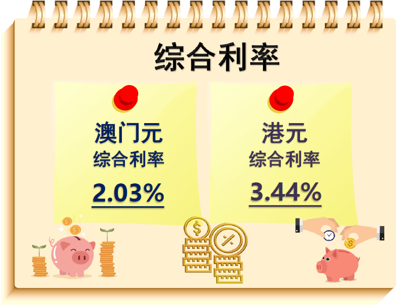 截至2024年9月底,澳门元及港元综合利率从2024年6月底的2.14%及3.60%,分别下跌11基点及17基点至2.03%及3.44%。