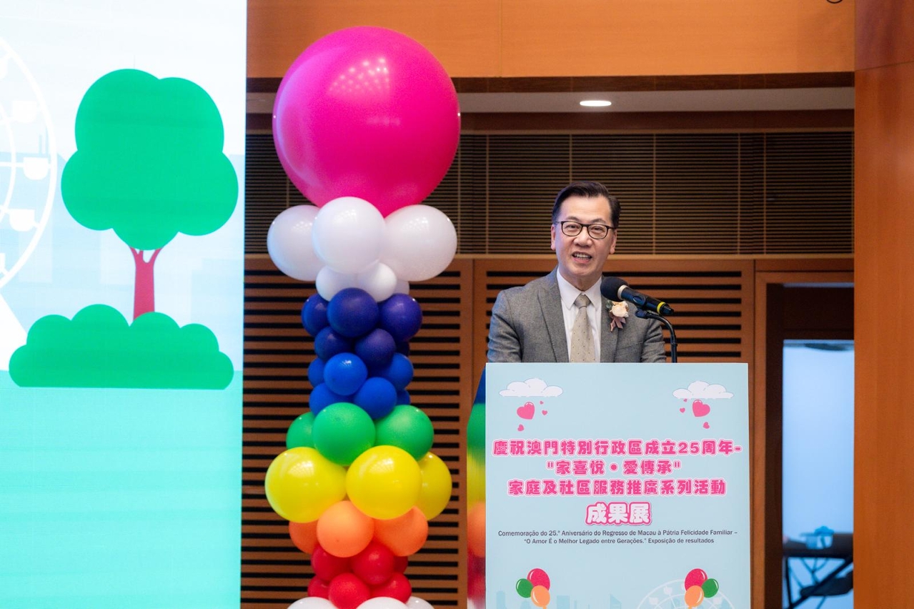 2024年为国际家庭年30周年及澳门特别行政区成立25周年,社会工作局联同澳门工会联合总会、圣公会澳门社会服务处,以及6个“分区协作联网”共40多间社服机构,于今(24)日假澳门科学馆会议厅举办庆祝澳门特别行政区成立25周年 -“家喜悦‧爱传承”家庭及社区服务推广系列活动成果展,由社会工作局邓玉华副局长、中央人民政府驻澳门特别行政区联络办公室社会工作部赵河清副部长、教育及青年发展局蔡敏芝代副局长、法务局行政及财政管理厅李胜里厅长、文化局读者服务及推广处林颖娜处长、卫生局余斌护士长、澳门工会联合总会张国然副会长、圣公会澳门社会服务处叶鉴波服务总监主持启动仪式。现场设有亲子沉浸式互动剧场、时光走廊体验、图画填色摊位、家庭教育成品展示、吉祥物拍照,以及活动主题微电影“以爱连城”首映等,共有800人次参与。