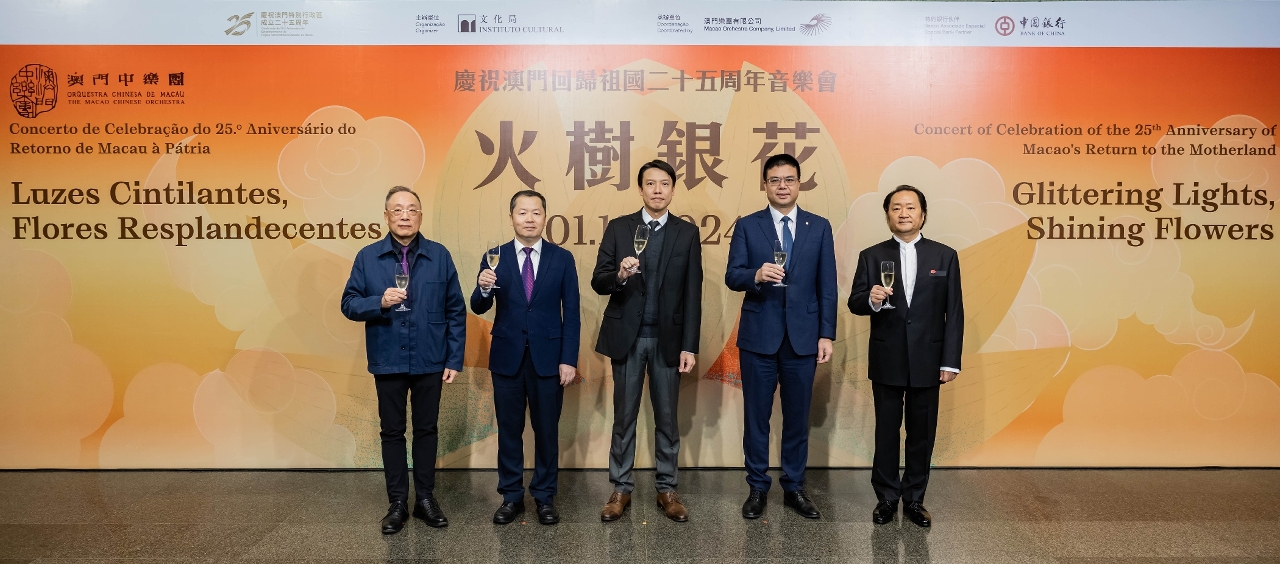 《火树银花》音乐会开始前,文化局代副局长蔡健龙、中央人民政府驻澳门特别行政区联络办公室宣传文化部处长王惠杰、中国银行澳门分行资深业务总监许志瑜、澳门乐团有限公司董事许健华及澳门中乐团音乐总监兼首席指挥张列等主持祝酒仪式。