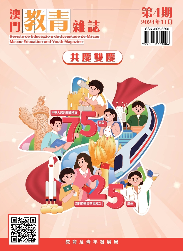 《澳门教青杂志》第4期已出版。今年是中华人民共和国成立75周年和澳门特别行政区成立25周年的双庆之年,本期主题是“共庆双庆”。教育及青年发展局局长龚志明在专访中总结澳门特别行政区成立以来,尤其近五年非高等教育、高等教育以及青年工作所取得的成绩与经验,并分享澳门教育未来的发展方向。澳门中华教育会副会长李沛霖先生在“人物剪影”栏目中与读者分享其投身教育事业的历程和心得,回顾和展望澳门教育的发展。另外,本澳教育界、青年社团及学生社团亦于今年举办了一系列双庆活动,展现澳门回归祖国后社会的繁荣面貌,带动全民庆贺气氛与爱国爱澳情怀。