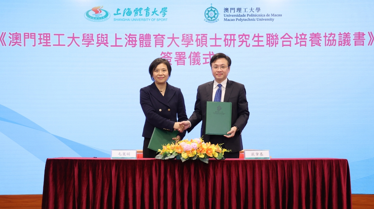 《澳门理工大学与上海体育大学硕士研究生联合培养协议书》签署仪式在澳理大举行。严肇基致词时表示,澳理大与上海体育大学合作历史悠久,为澳门培养了大批体育运动和管理人才,推动澳门体育人才向上流动。是次签署新的联合培养研究生合作协议,在人才培养、资源共享、科研项目、师生交流等领域的开展更加多元和深入的合作,乘着2025年澳门参与举办第十五届全国运动会的契机,共同为建设教育强国、助力国家及澳门的体育事业发展贡献力量。