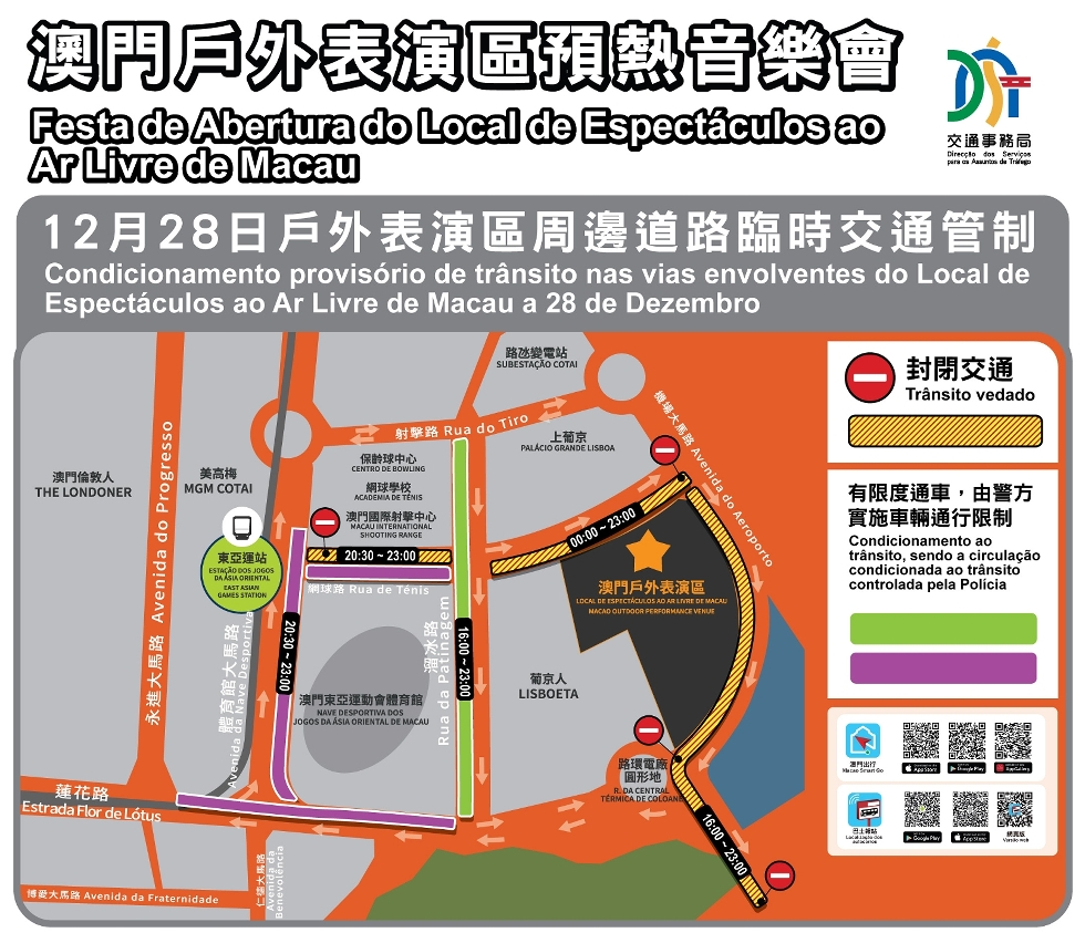 澳门户外表演区将于12月28日晚上举行首场演出活动,预计1万5千观众参与,当天下午4时开始入场,活动约于晚上9时结束。配合演出安排及观众往返场地,当天表演区周边道路会实施相应临时交通管制措施,并会临时调整公共交通服务安排以疏导人潮。交通事务局建议观众尽量使用公共交通及集体运输工具往返演出场地,并留意最新交通资讯,提早规划行程。