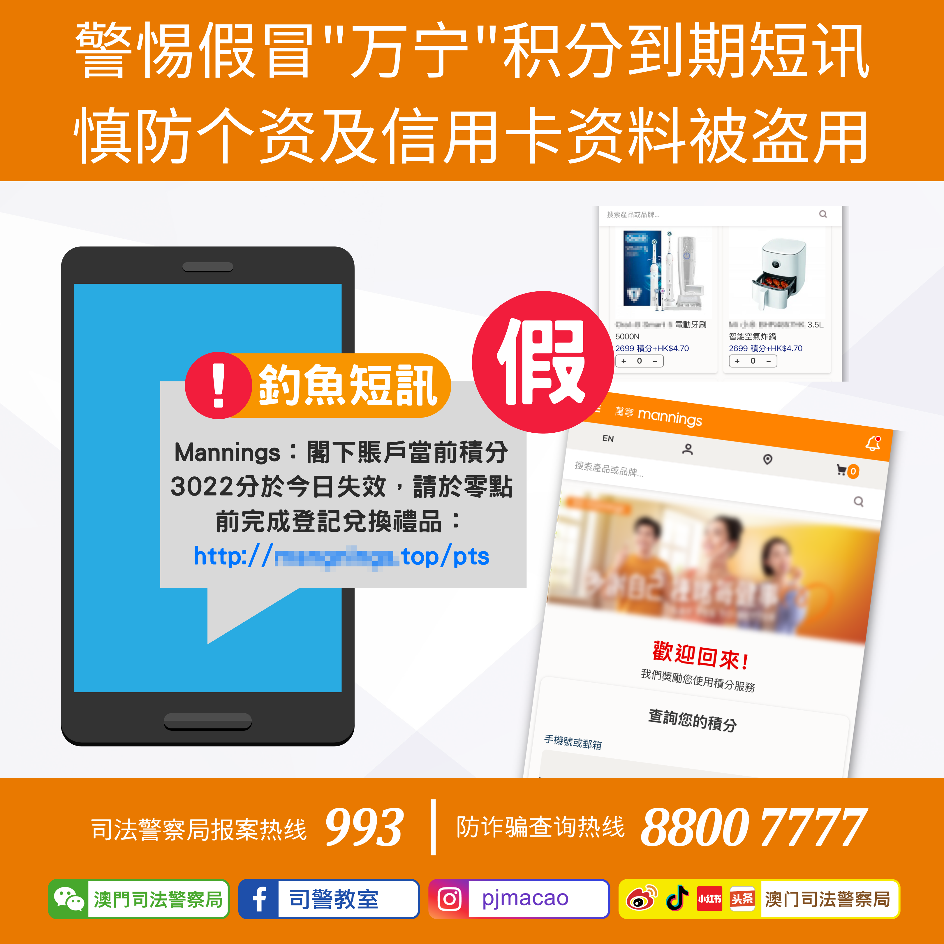 近日司警局发现骗徒故伎重施,又再大量滥发假冒“万宁 Mannings”的积分到期短讯,诱骗市民点击短讯内的钓鱼连结以积分及低价换购礼品,借此套取市民个人及信用卡资料后再进行非授权的大额交易,并于最近一周内造成至少5名市民受骗,合共损失逾3万澳门元。