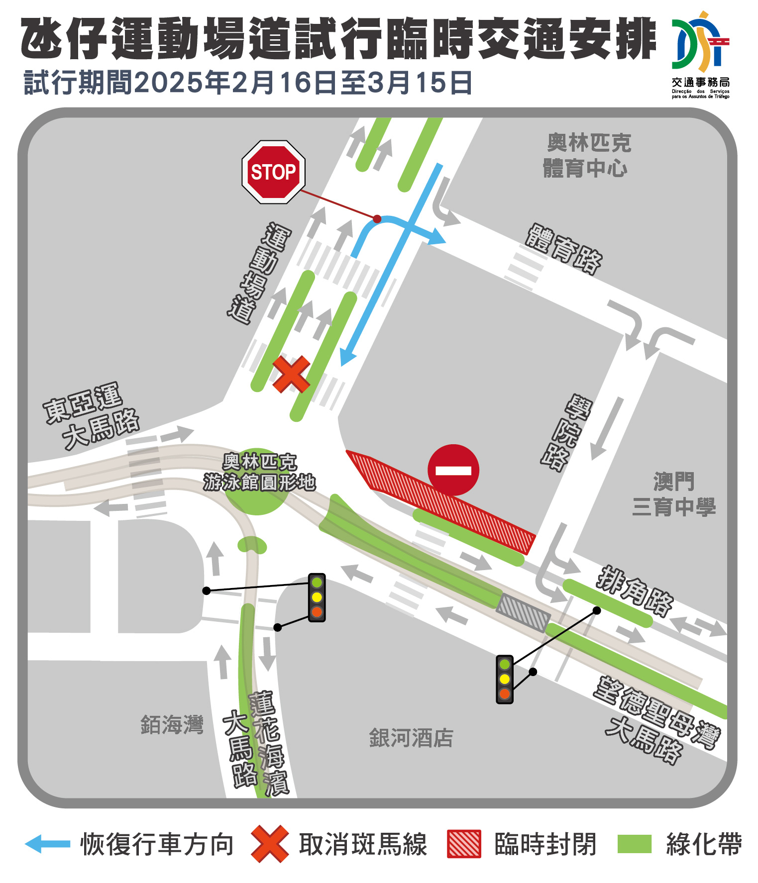 为提升周边道路疏导能力,2月16日至3月15日临时试行恢复运动场道往奥林匹克游泳馆圆形地及运动场道(往运动场圆形地方向)右转至体育路的行车安排,而位于运动场道与学院路之间的一段排角路将临时封闭,运动场道邻近奥林匹克游泳馆圆形地的斑马线亦会暂停使用,市民可使用运动场道邻近体育路的斑马线。(具体请查阅附图3)。