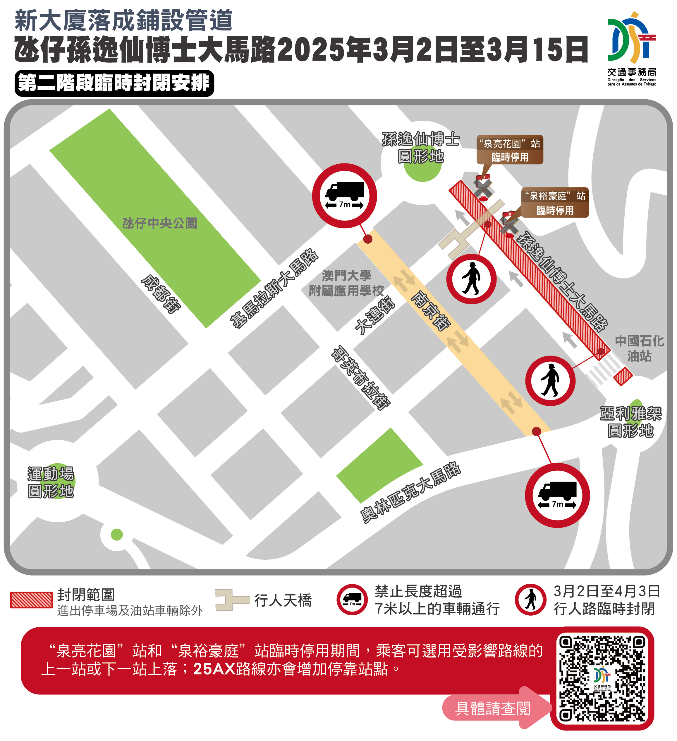 因应有新大厦落成须进行工程连接管道,介乎亚利雅架圆形地与孙逸仙博士圆形地的一段氹仔孙逸仙博士大马路自2月13日起实施临时交通措施,并于2月15日至3月15日期间分阶段实施封闭交通,24条巴士线受影响。