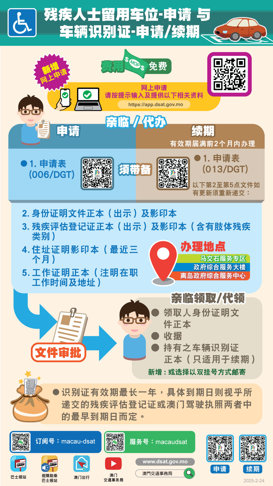 交通事务局为进一步推动电子政务,实现市民“一次跑”完成手续,由2月24日(周一)起新增网上办理“残疾人士留用车位”之申请,以及“残疾人士车辆识别证”之申请及续期服务。有需要人士可登入交通事务局网上服务https://app.dsat.gov.mo,并按提示输入及提供相关资料,以完成相关申请或续期手续。