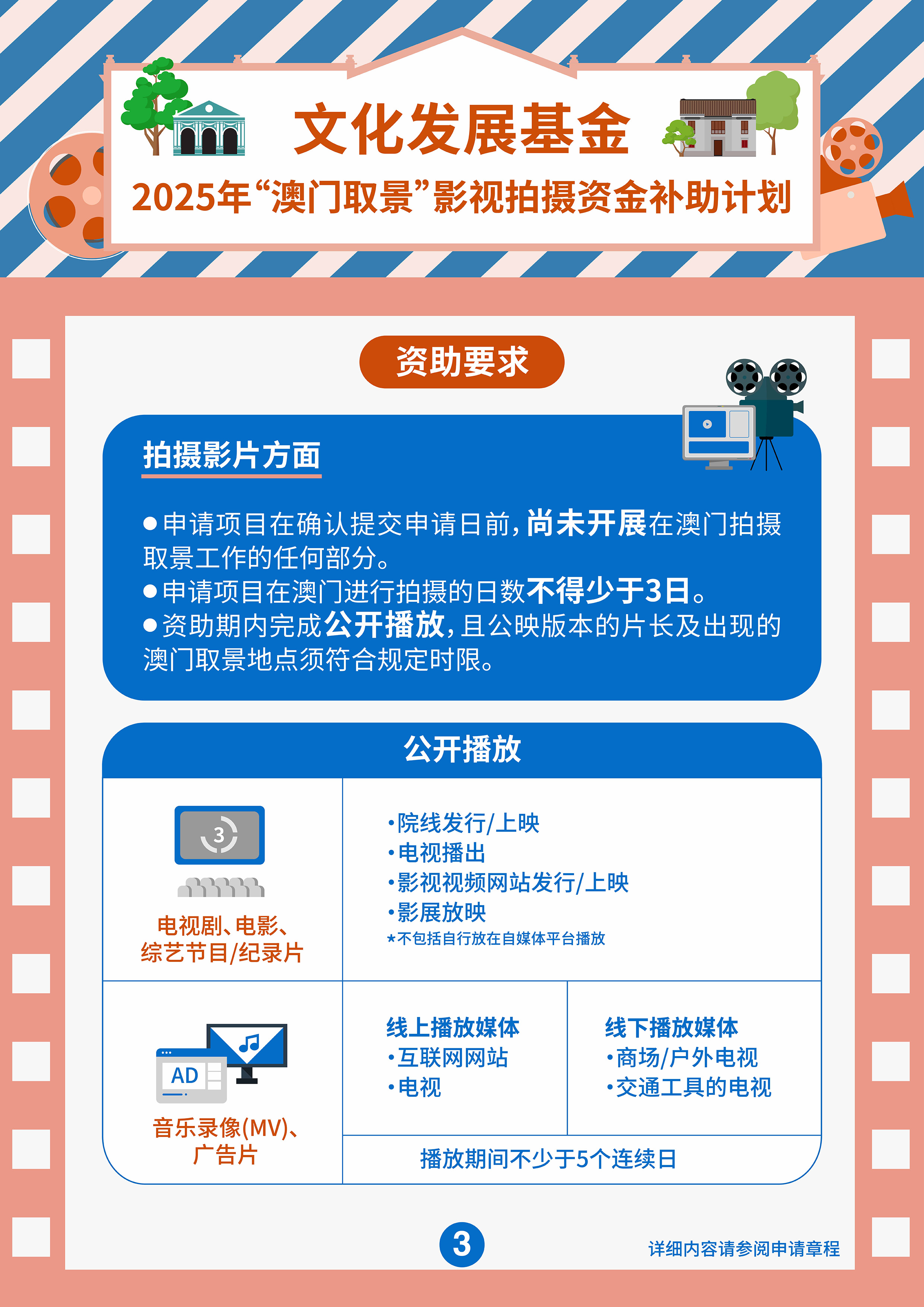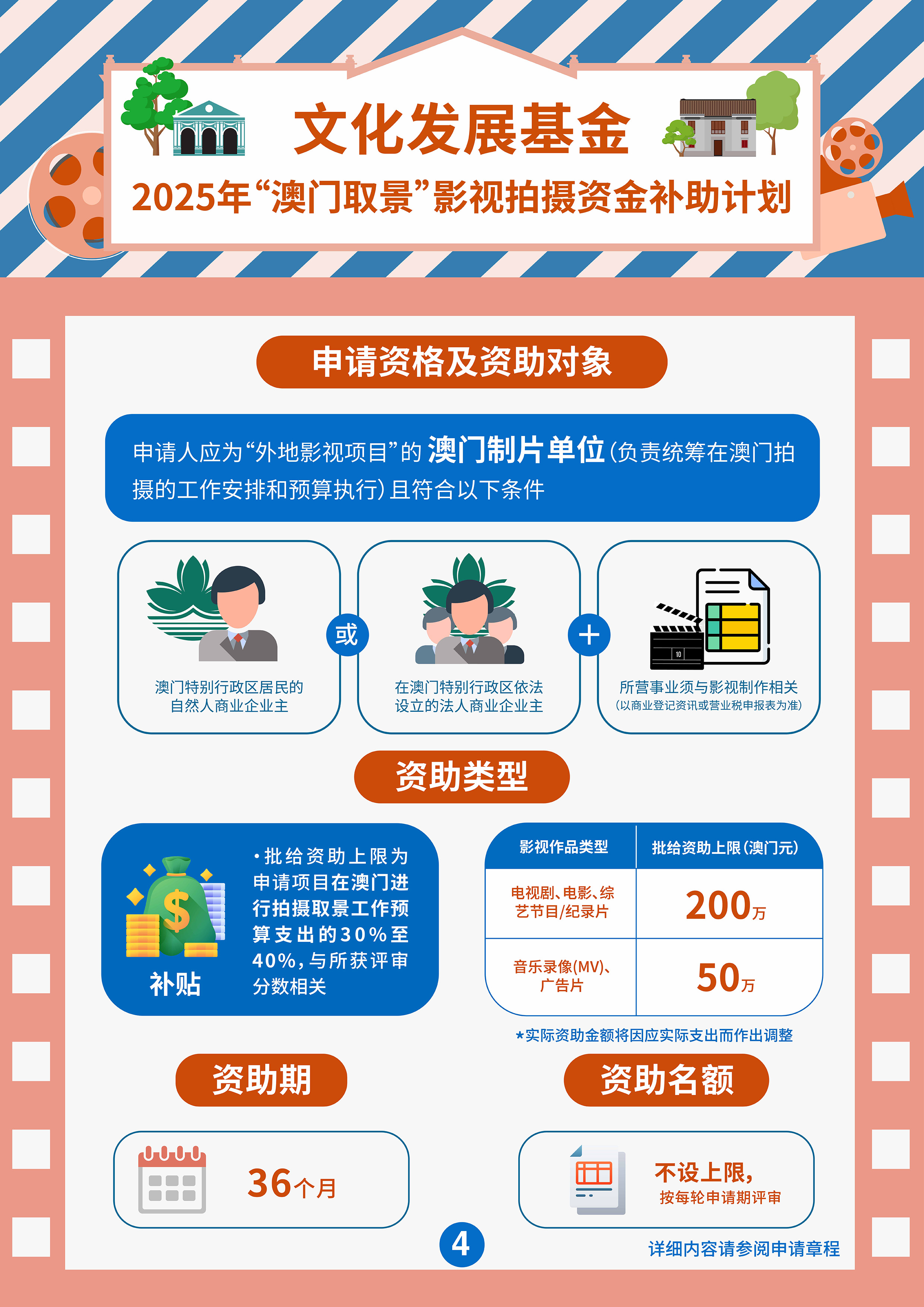 今年将推出四轮申请,第一轮申请期由2025年2月28日至3月31日,倘预算使用完毕,则申请期提早结束。资助计划接受在确认提交申请日前尚未开展在澳门取景拍摄工作,且在澳拍摄的日数不少于3天的外地影视项目,由外地拍摄团队主导并来澳参与拍摄工作。资助申请须由作为澳门制片单位的澳门商业企业主提出,其所营事业须与影视制作相关。获资助的影视项目须在资助期内完成公开播放,且公映版本的片长及片中出现澳门取景地点的时长,须符合章程规定的时限要求。
