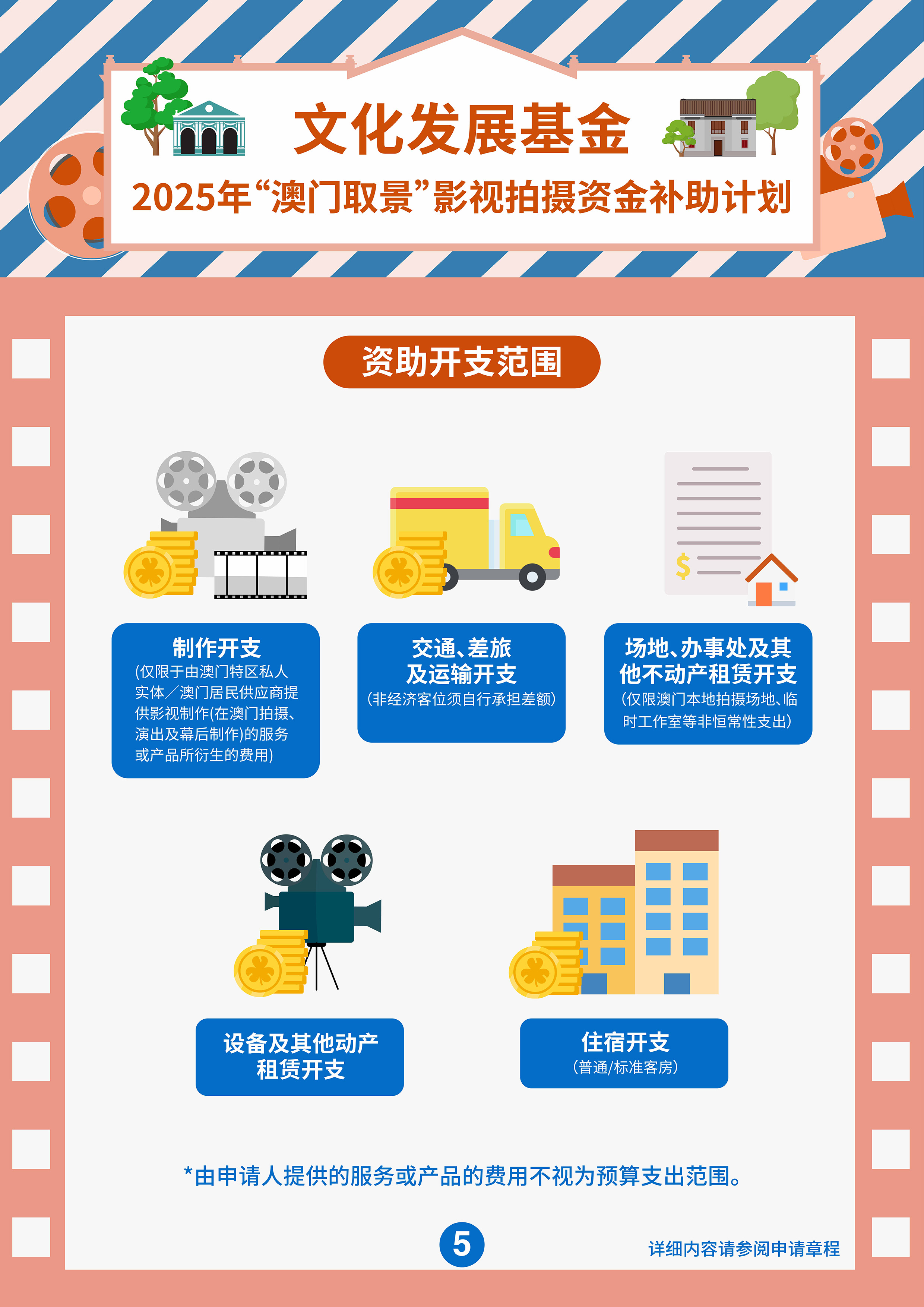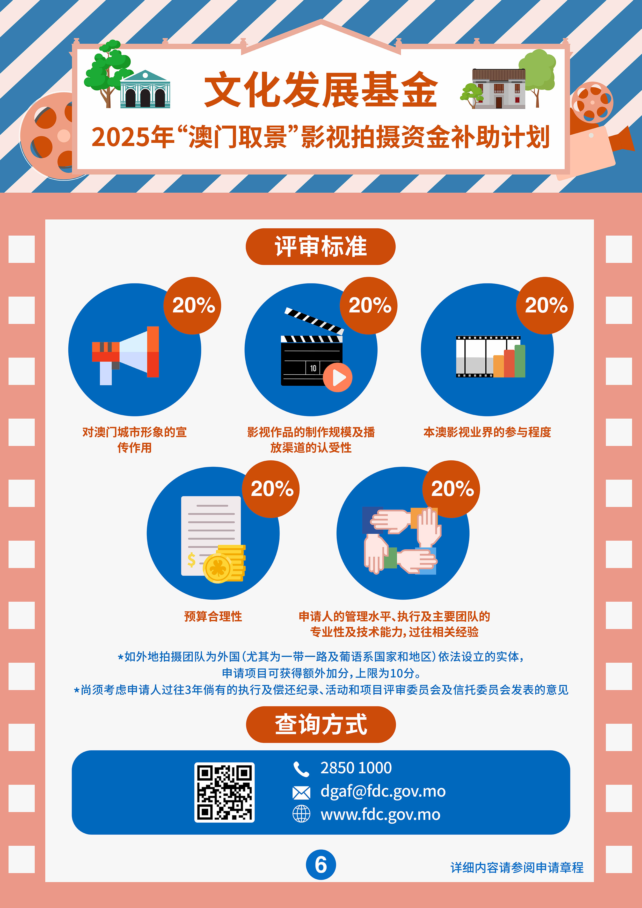 文化发展基金继续推出“澳门取景”影视拍摄资金补助计划,鼓励外地拍摄团队到澳门实地取景拍摄,通过影视作品宣传澳门城市形象及提升国际知名度,带动文创及旅游的联动性,推动澳门影视产业发展。