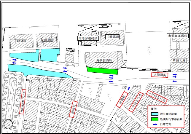 ● 2025年3月8日至4月12日围封火船头街万事发酒店门外一段行车路(附图二)。位于路段内的“内港客运码头"站于3月8日上午10时起临时停用,乘客可改用同一站点另一个分流站,即靠近火船头街近11号码头的站点上落(附图二B)。
