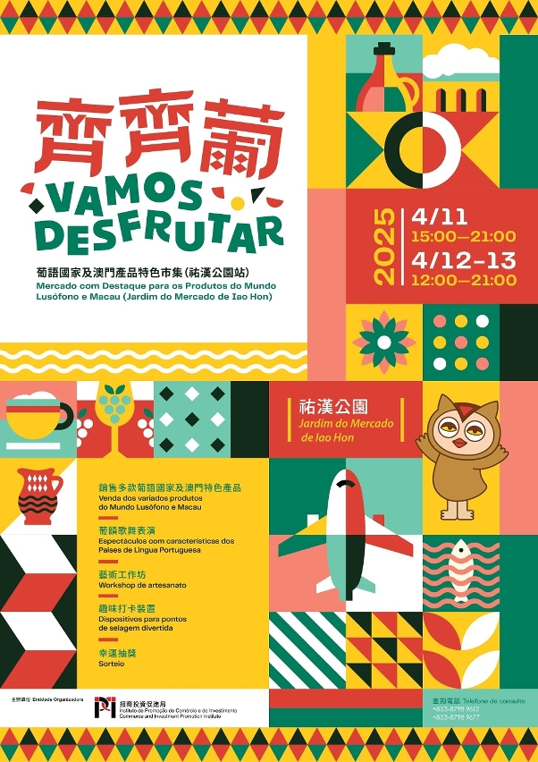 2025“齐齐葡-葡语国家及澳门产品特色市集”(佑汉公园站)将于4月11至13日(周五至周日)入北区登场佑汉公园。作为以“吃喝玩乐购”为载体展现澳门中葡平台丰富多元魅力的“齐齐葡”2025年首站活动,将有18家澳门中小企展销逾200款葡语国家及澳门特色产品,现场轮替上演24场具有葡语国家特色的歌舞表演及28场艺术工作坊等精彩节目。