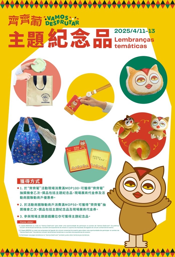 观众于“齐齐葡”现场消费满100澳门元,可获一次“齐齐葡”抽奖机会,即抽即奖,活动现场共准备逾5,000份包括葡公鹰“首发”周边精美纪念品及商户代金券,数量有限,送完即止。同时,活动主办单位招商投资促进局联动周边商圈30家企业的积极响应和支持,推出限定联动优惠。,数量有限,送完即止。“齐齐葡”(佑汉公园站)多方面着力提升入场观众与会体验以带动消费及吸引人流,扩大活动辐射效应,促进北区经济,发挥澳门作为中葡平台的作用。