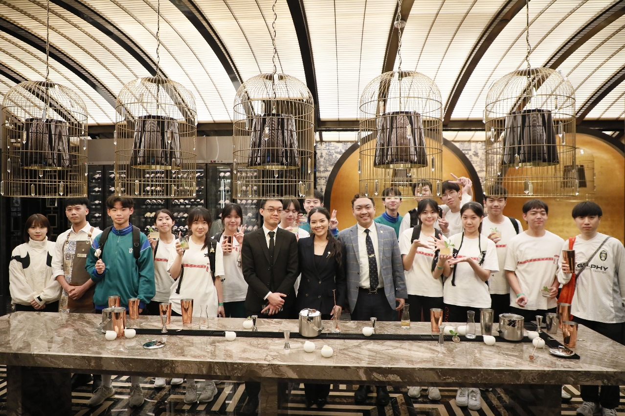 参与者到澳娱综合旗下的澳门上葡京综合度假村参观荣获2025年《福布斯旅游指南》五星嘉许的御花园、当奥丰素1890及味赏等特色餐厅,亲身感受高端餐饮及服务标准,并由度假村首席调酒师马铭康带领学生体验由世界调酒冠军创作的味赏酒吧无酒精调饮工作坊,了解可持续发展的酒吧创新模式,领略经典美食如何巧妙融合及传承中西文化。