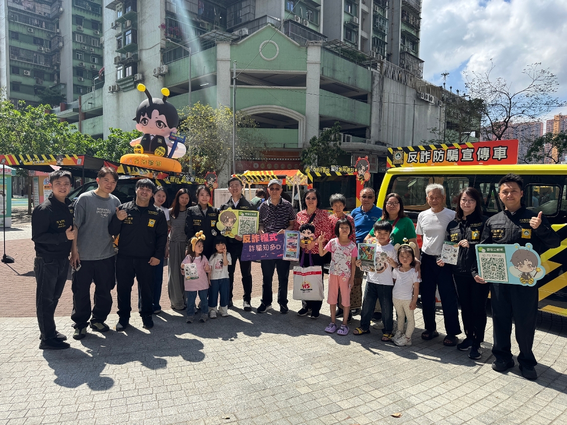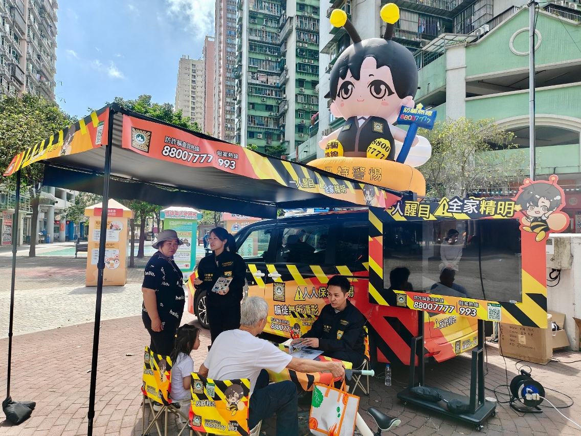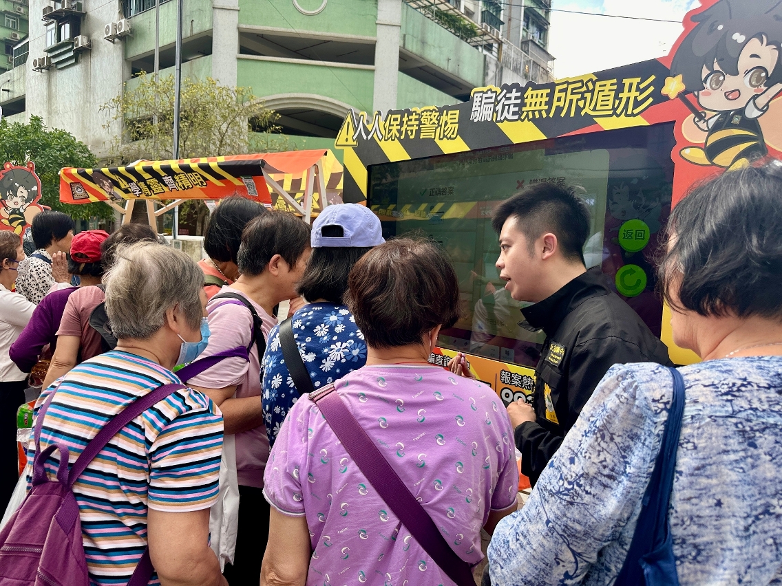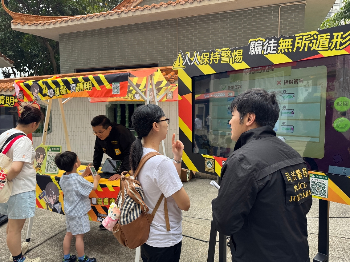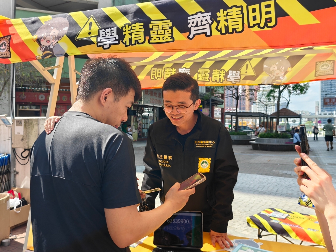司法警察局全新设计的“反诈宣传车”早前已试运行巡访本澳七所高等院校,开展防骗宣传工作。为进一步扩大防骗资讯的覆盖范围,宣传车现将巡回范围逐步拓展至全澳各社区。首阶段活动已于4月19日及21日分别在氹仔花城公园侧及筷子基绿杨花园休憩区举行,两场活动共吸引逾500名市民参与。适逢复活节假期,不少市民携同家人到场参与,涵盖长者、青少年等不同年龄层,有效将防骗意识深入社区各个群体,为构建全民防骗网络发挥积极作用。