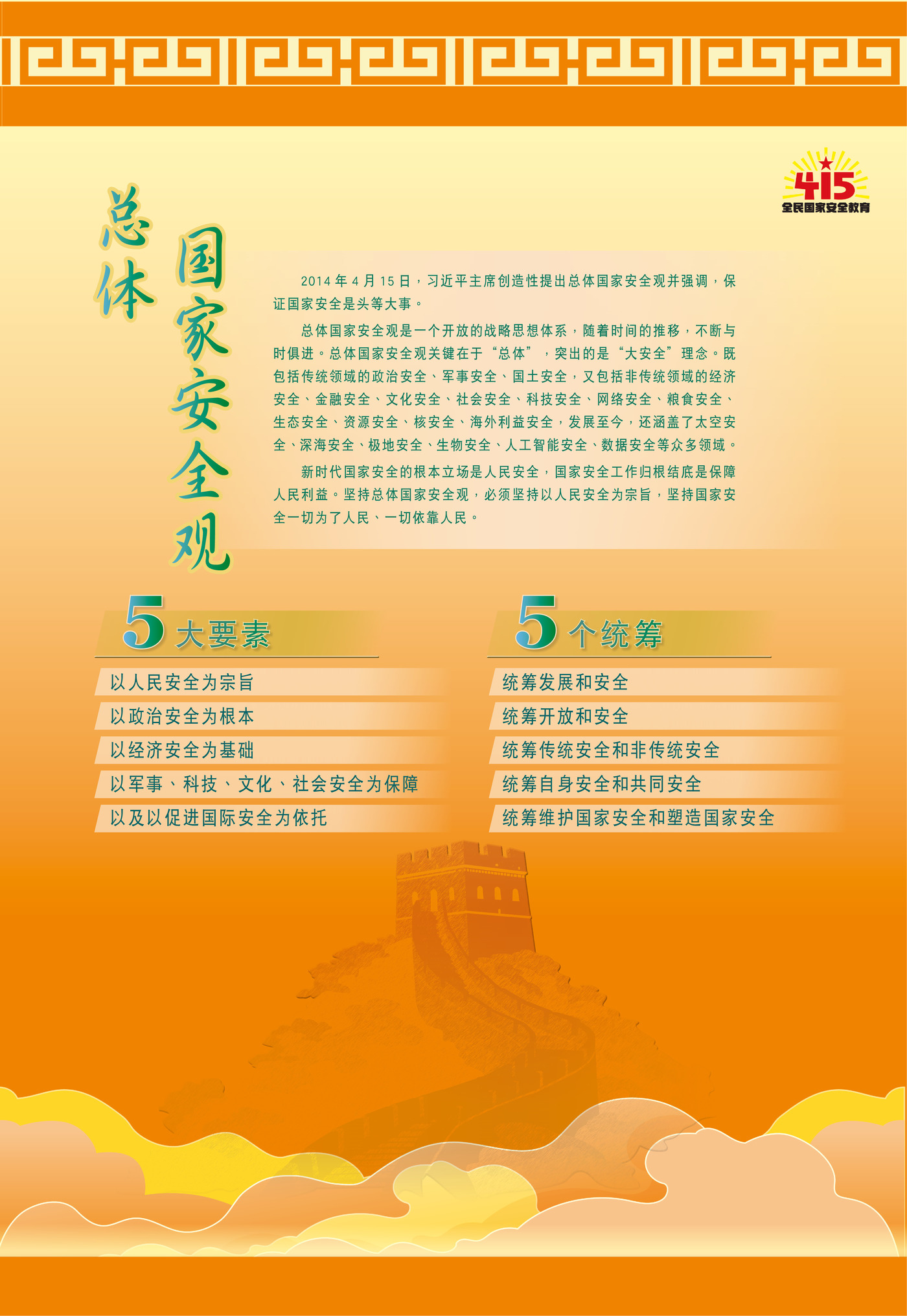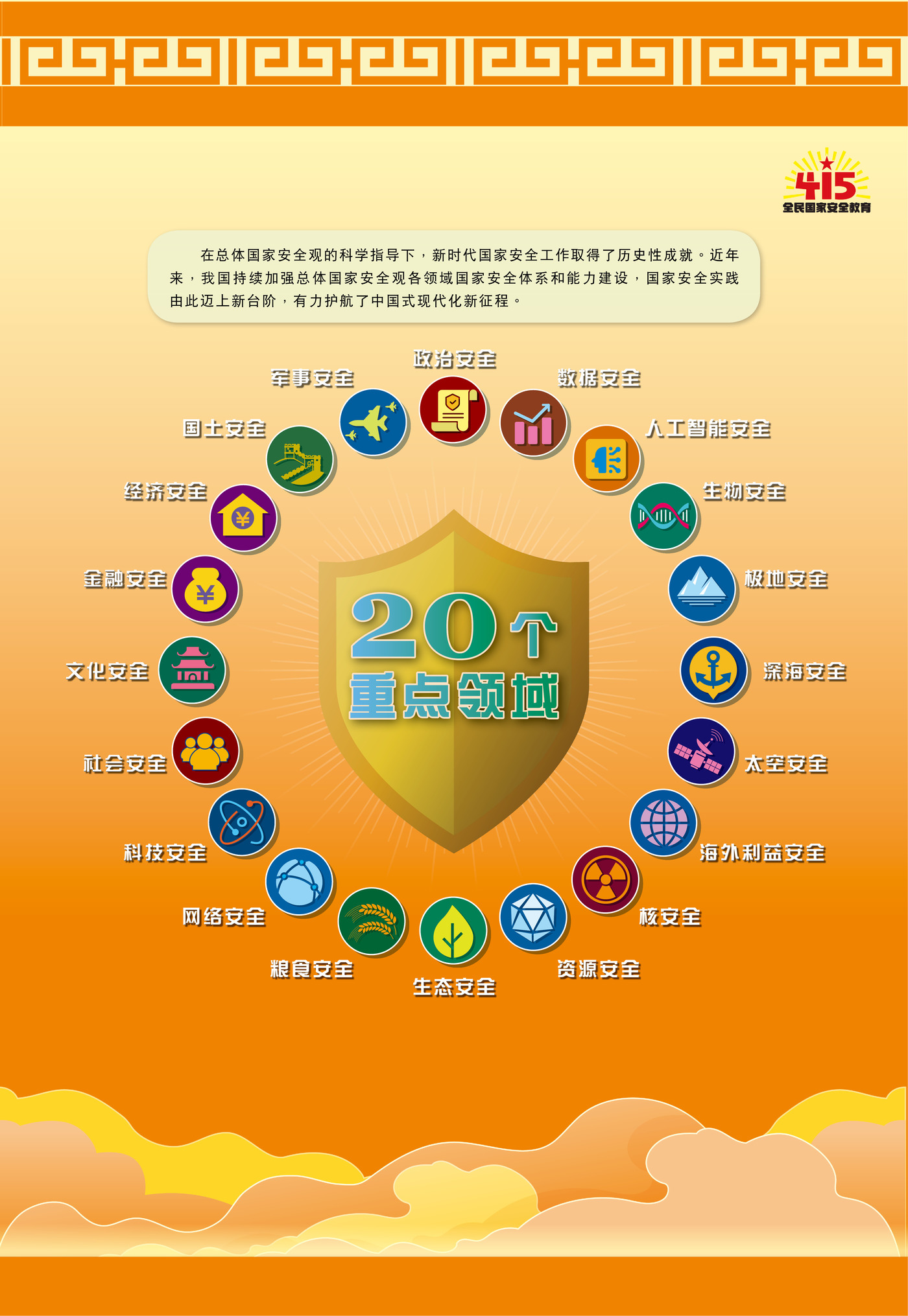 总体国家安全观涵盖20个环环相扣的重点领域,包括政治安全、军事安全、国土安全、经济安全、金融安全、科技安全、人工智能安全、网络安全、数据安全、社会安全、文化安全、粮食安全、生态安全、生物安全、资源安全、核安全、太空安全、深海安全、极地安全、海外利益安全;展览的第二部分阐述了国家保障各项领域安全上取得的显着进展。
